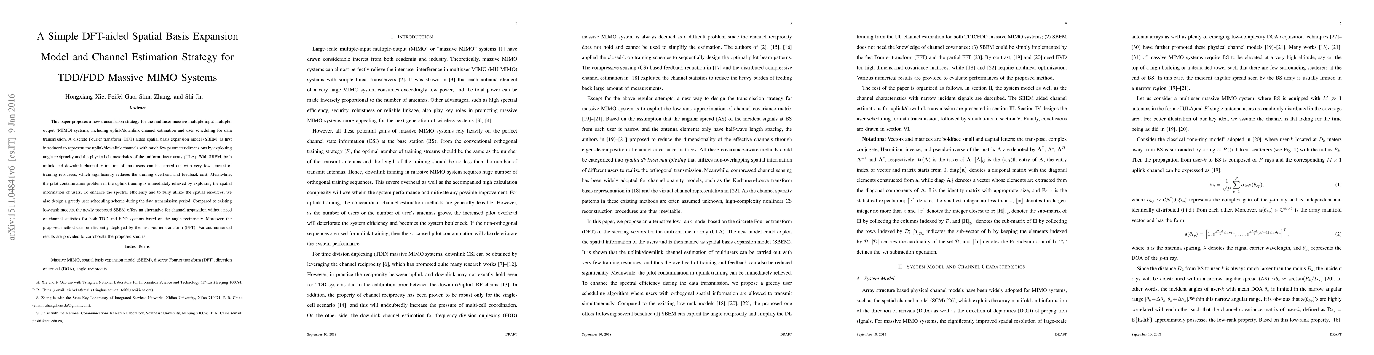 This paper proposes a new transmission strategy for the multiuser massive multiple-input multiple-output (MIMO) systems, including uplink/downlink channel estimation and user scheduling for data transmission. A discrete Fourier transform (DFT) aided spatial basis expansion model (SBEM) is first introduced to represent the uplink/downlink channels with much few parameter dimensions by exploiting angle reciprocity and the physical characteristics of the uniform linear array (ULA). With SBEM, both uplink and downlink channel estimation of multiuser can be carried out with very few amount of training resources, which significantly reduces the training overhead and feedback cost. Meanwhile, the pilot contamination problem in the uplink raining is immediately relieved by exploiting the spatial information of users. To enhance the spectral efficiency and to fully utilize the spatial resources, we also design a greedy user scheduling scheme during the data transmission period. Compared to existing low-rank models, the newly proposed SBEM offers an alternative for channel acquisition without need of channel statistics for both TDD and FDD systems based on the angle reciprocity. Moreover, the proposed method can be efficiently deployed by the fast Fourier transform (FFT). Various numerical results are provided to corroborate the proposed studies.