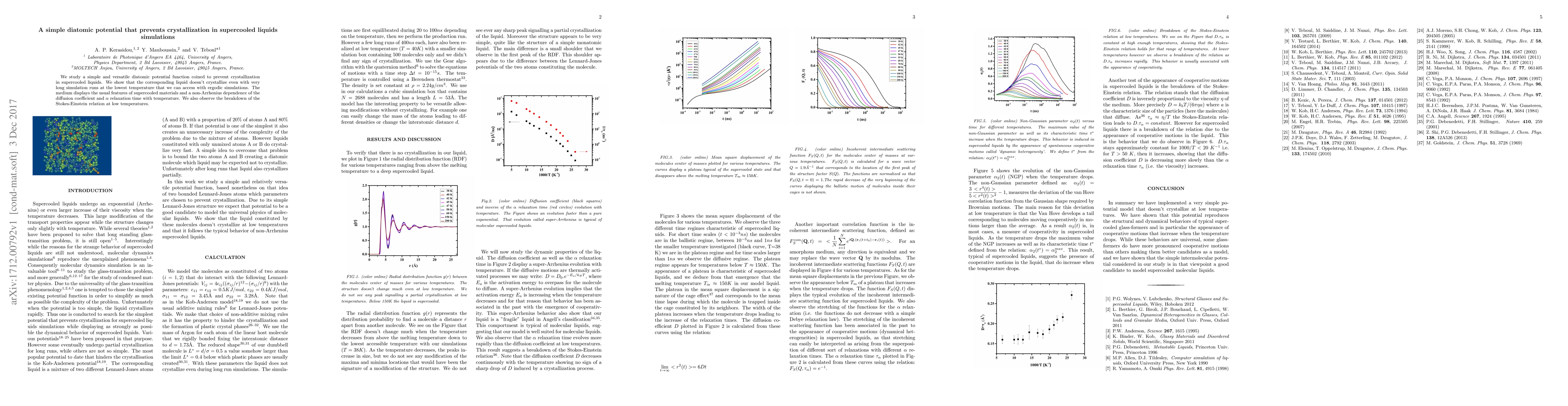 This paper introduces a novel diatomic potential function that effectively prevents crystallization in supercooled liquid simulations, demonstrating non-crystallization even at low temperatures over extended simulation times. The liquid exhibits typical supercooled material behaviors, including non-Arrhenius temperature dependence of diffusion and relaxation times, and a breakdown of the Stokes-Einstein relation at low temperatures.