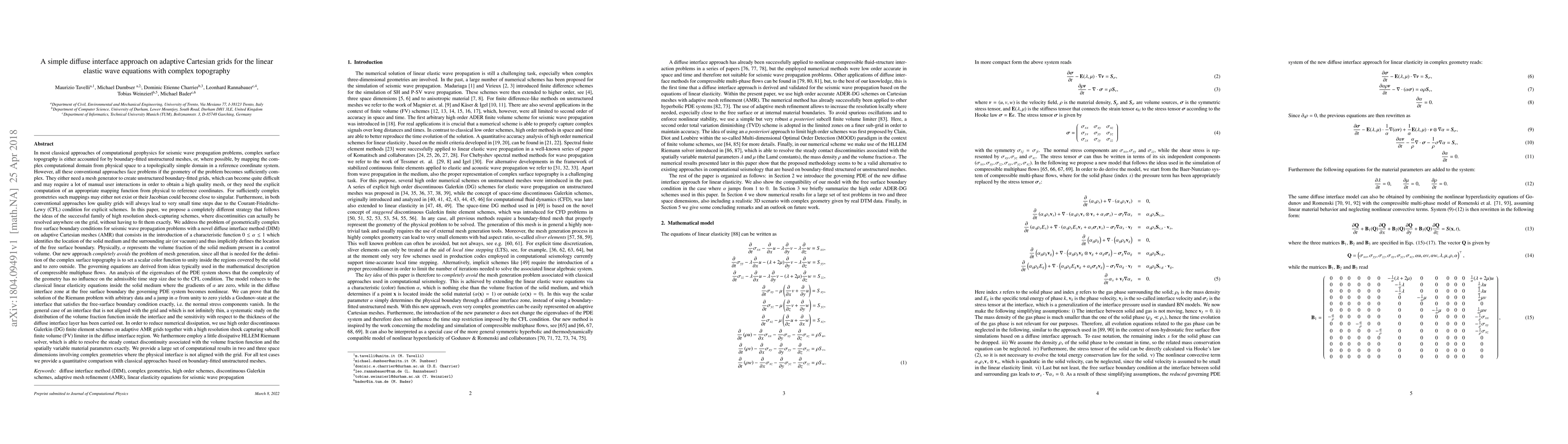 Researchers propose a new method to simulate seismic wave propagation over complex terrain without generating custom meshes, using a diffuse interface approach on adaptive Cartesian grids that adapts to the surface topography.