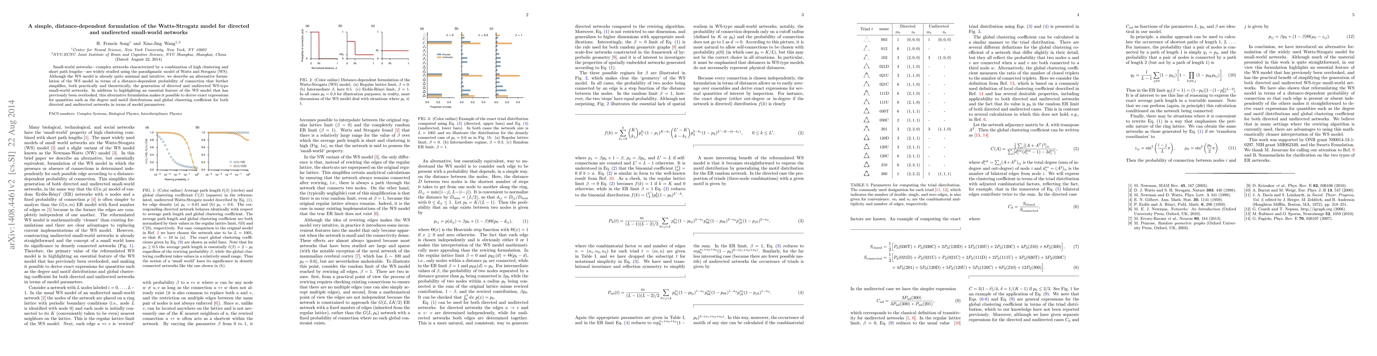 This paper proposes a simplified, distance-dependent version of the Watts-Strogatz model for generating directed and undirected small-world networks, allowing for exact expressions for degree and motif distributions and global clustering coefficients. This new formulation highlights an overlooked feature of the original model and facilitates easier theoretical analysis.