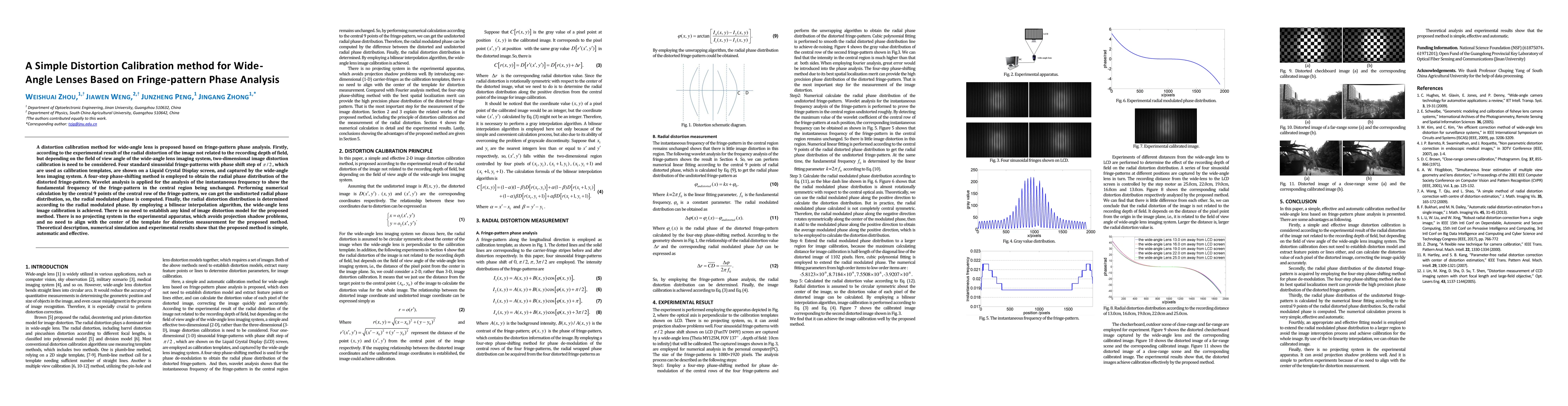 This paper proposes a simple distortion calibration method for wide-angle lenses using fringe-pattern phase analysis without requiring an image distortion model. It employs a four-step phase-shifting method and wavelet analysis to determine the radial distortion distribution, achieving calibration through bilinear interpolation.