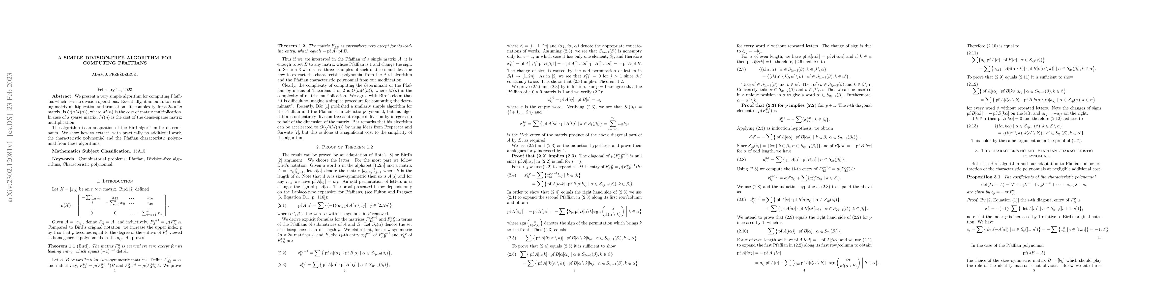 This paper introduces a straightforward division-free algorithm for computing Pfaffians through matrix multiplication and truncation, with a complexity of $O(nM(n))$. It adapts the Bird algorithm for determinants and efficiently extracts characteristic polynomials.