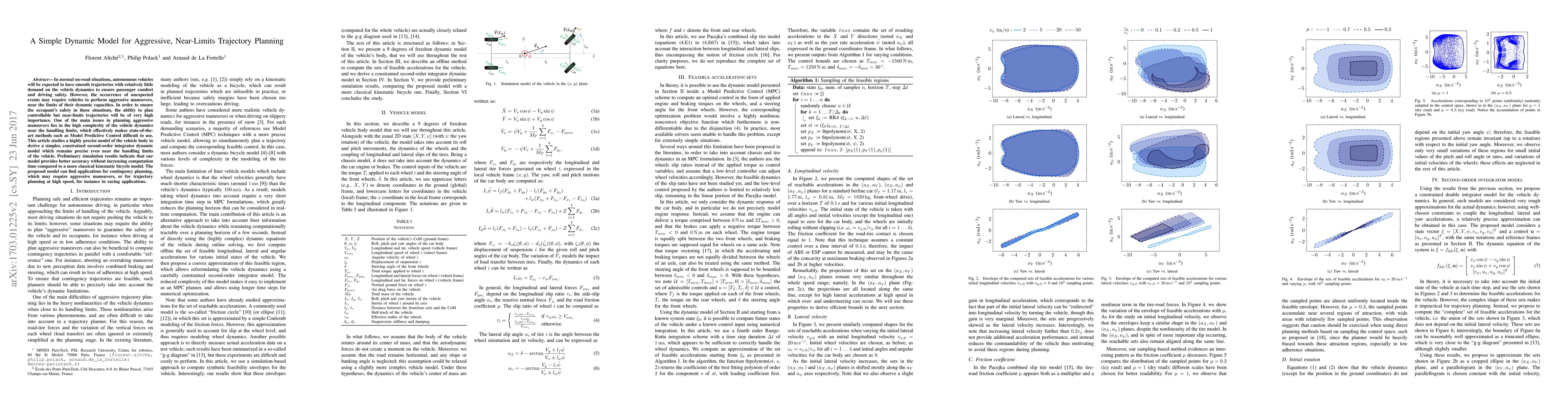In normal on-road situations, autonomous vehicles will be expected to have smooth trajectories with relatively little demand on the vehicle dynamics to ensure passenger comfort and driving safety. However, the occurrence of unexpected events may require vehicles to perform aggressive maneuvers, near the limits of their dynamic capacities. In order to ensure the occupant's safety in these situations, the ability to plan controllable but near-limits trajectories will be of very high importance. One of the main issues in planning aggressive maneuvers lies in the high complexity of the vehicle dynamics near the handling limits, which effectively makes state-of-the-art methods such as Model Predictive Control difficult to use. This article studies a highly precise model of the vehicle body to derive a simpler, constrained second-order integrator dynamic model which remains precise even near the handling limits of the vehicle. Preliminary simulation results indicate that our model provides better accuracy without increasing computation time compared to a more classical kinematic bicycle model. The proposed model can find applications for contingency planning, which may require aggressive maneuvers, or for trajectory planning at high speed, for instance in racing applications.