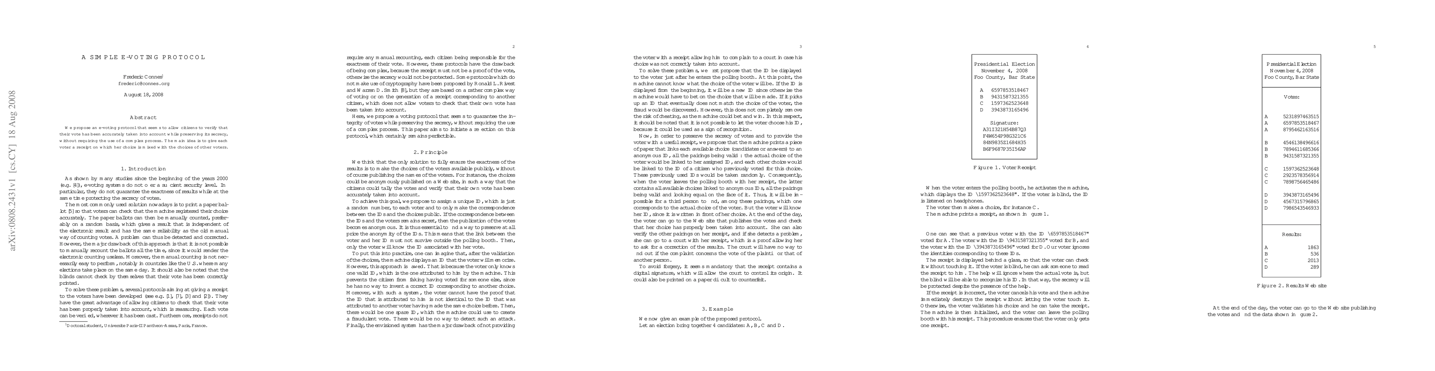 Summary: This paper introduces a straightforward e-voting protocol enabling voters to verify their vote's accuracy while maintaining secrecy, by issuing receipts that mix individual choices with others, avoiding complex processes.