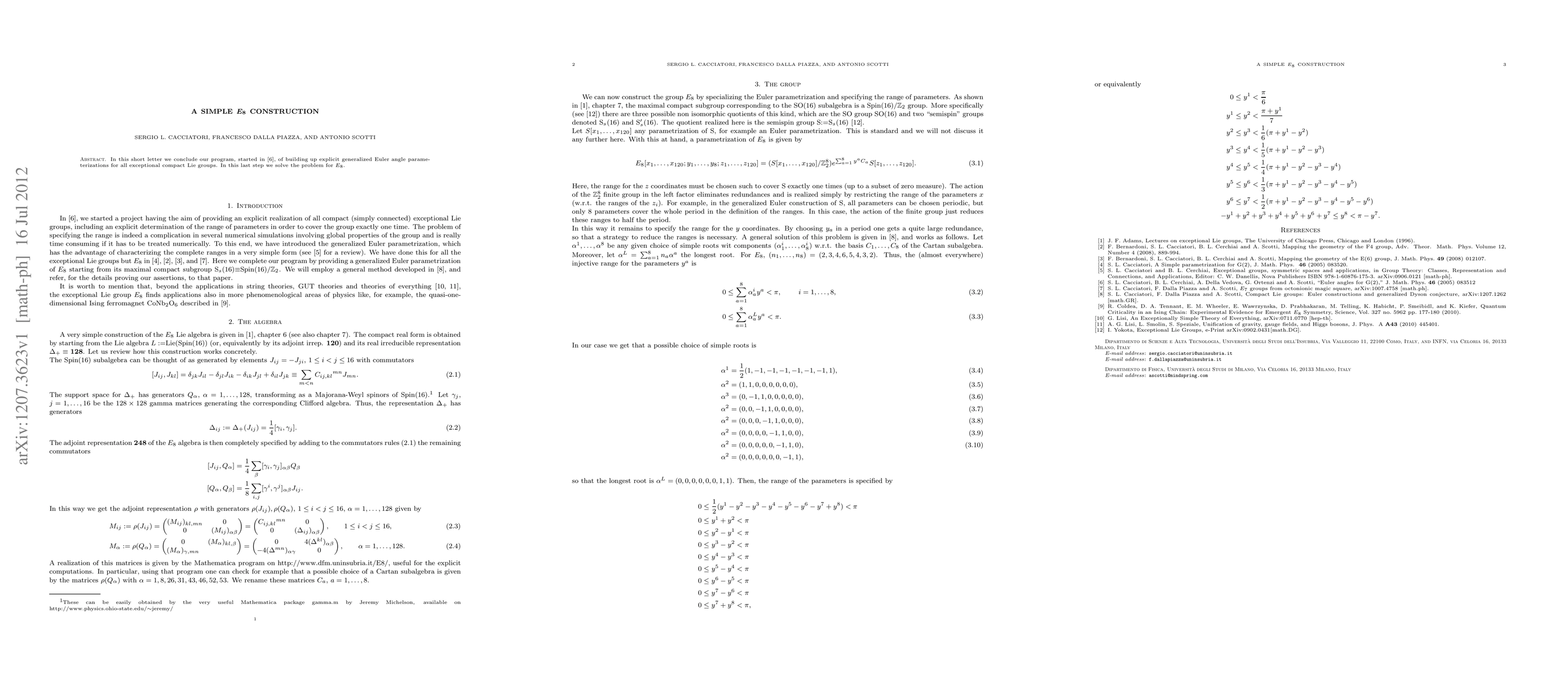 In this short letter we conclude our program, started in [J. Math. Phys. 46 (2005) 083512], of building up explicit generalized Euler angle parameterizations for all exceptional compact Lie groups. In this last step we solve the problem for E8.