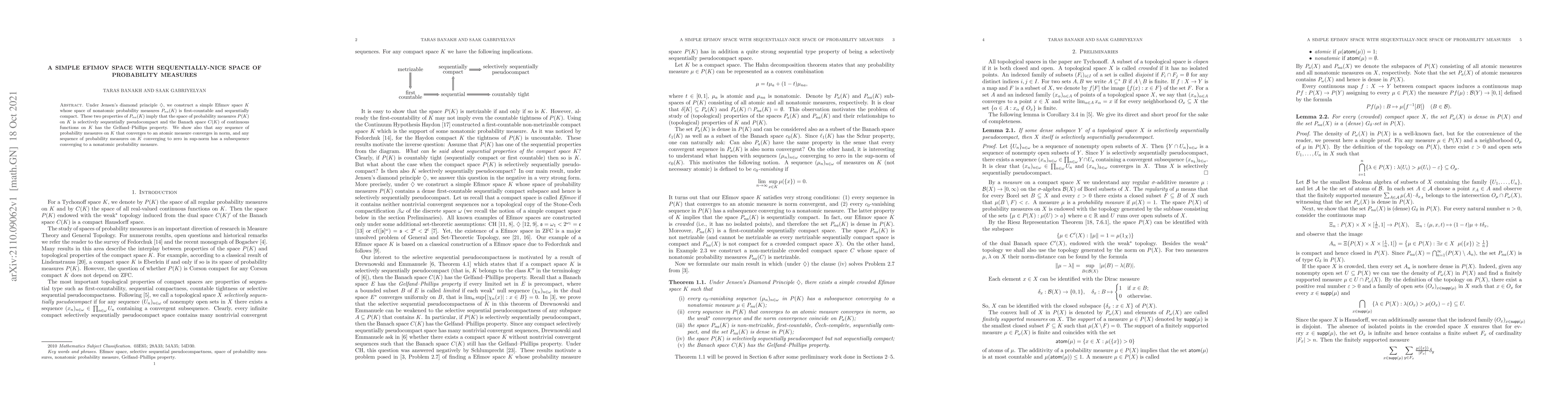 Under Jensen's diamond principle, the paper constructs a simple Efimov space K with a first-countable, sequentially compact space of nonatomic probability measures. This leads to P(K) being selectively sequentially pseudocompact, and C(K) having the Gelfand-Phillips property. Additionally, sequences of probability measures on K converging to atomic or zero measures exhibit specific convergence behaviors.