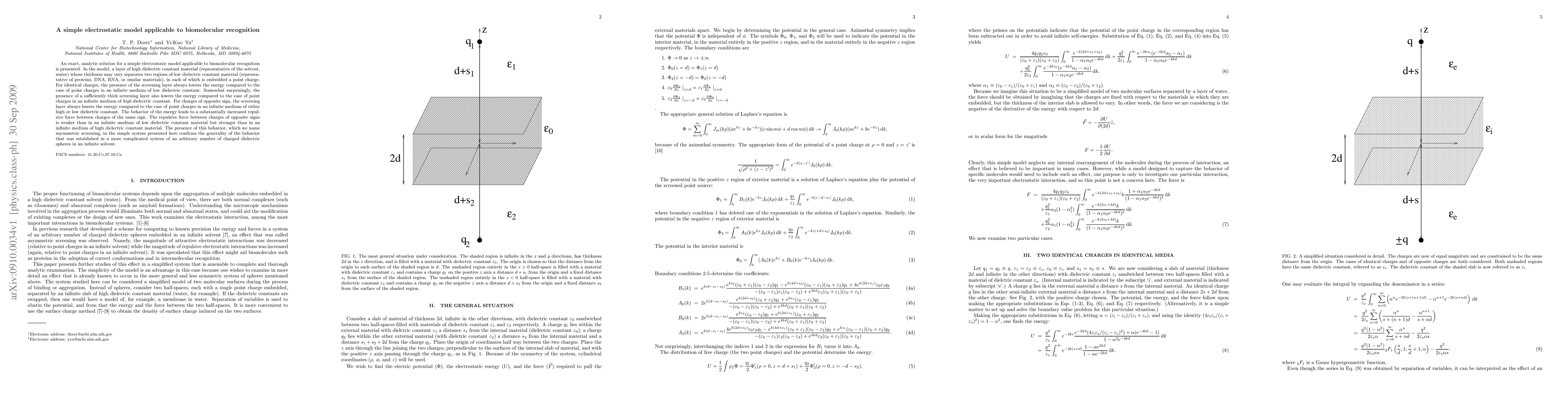 An exact, analytic solution for a simple electrostatic model applicable to biomolecular recognition is presented. In the model, a layer of high dielectric constant material (representative of the solvent, water) whose thickness may vary separates two regions of low dielectric constant material (representative of proteins, DNA, RNA, or similar materials), in each of which is embedded a point charge. For identical charges, the presence of the screening layer always lowers the energy compared to the case of point charges in an infinite medium of low dielectric constant. Somewhat surprisingly, the presence of a sufficiently thick screening layer also lowers the energy compared to the case of point charges in an infinite medium of high dielectric constant. For charges of opposite sign, the screening layer always lowers the energy compared to the case of point charges in an infinite medium of either high or low dielectric constant. The behavior of the energy leads to a substantially increased repulsive force between charges of the same sign. The repulsive force between charges of opposite signs is weaker than in an infinite medium of low dielectric constant material but stronger than in an infinite medium of high dielectric constant material. The presence of this behavior, which we name asymmetric screening, in the simple system presented here confirms the generality of the behavior that was established in a more complicated system of an arbitrary number of charged dielectric spheres in an infinite solvent.