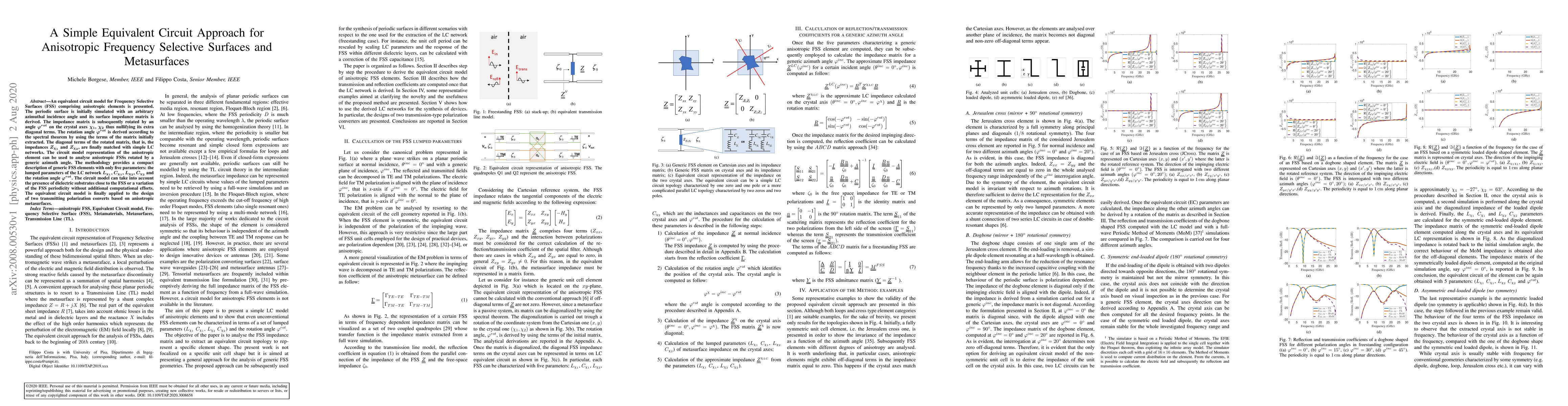 This paper presents an equivalent circuit model for anisotropic Frequency Selective Surfaces (FSS) using a simplified LC network approach. The model effectively nullifies extra diagonal terms and matches the impedances with the LC networks, allowing analysis of rotated FSSs with minimal parameters.