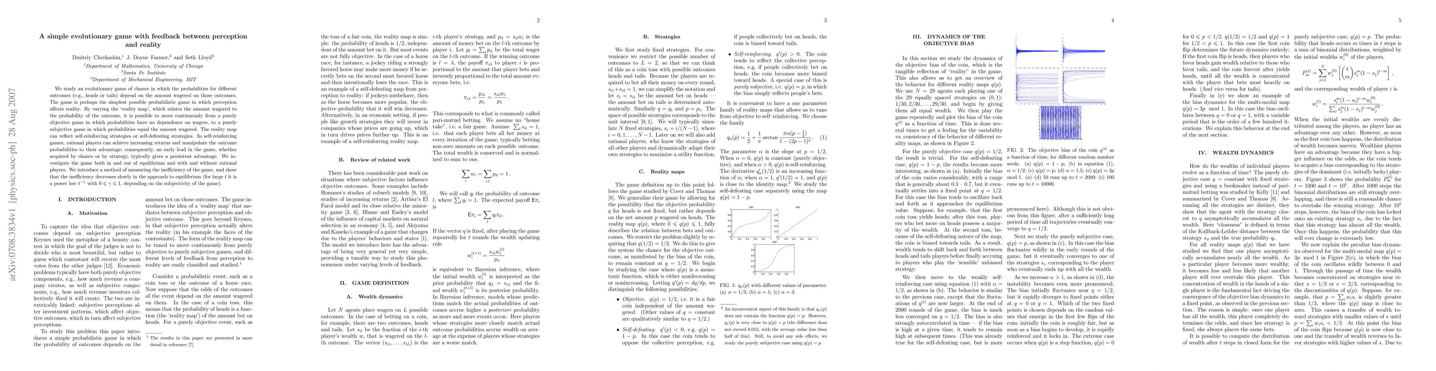 We study an evolutionary game of chance in which the probabilities for different outcomes (e.g., heads or tails) depend on the amount wagered on those outcomes. The game is perhaps the simplest possible probabilistic game in which perception affects reality. By varying the `reality map', which relates the amount wagered to the probability of the outcome, it is possible to move continuously from a purely objective game in which probabilities have no dependence on wagers, to a purely subjective game in which probabilities equal the amount wagered. The reality map can reflect self-reinforcing strategies or self-defeating strategies. In self-reinforcing games, rational players can achieve increasing returns and manipulate the outcome probabilities to their advantage; consequently, an early lead in the game, whether acquired by chance or by strategy, typically gives a persistent advantage. We investigate the game both in and out of equilibrium and with and without rational players. We introduce a method of measuring the inefficiency of the game and show that in the large time limit the inefficiency decreases slowly in its approach to equilibrium as a power law with an exponent between zero and one, depending on the subjectivity of the game.