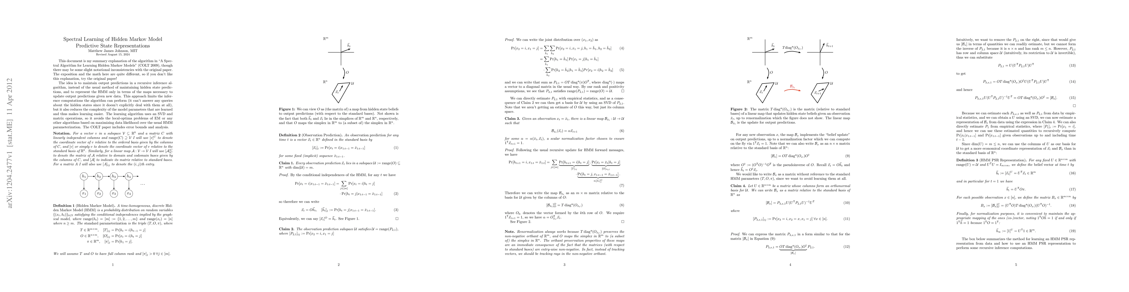 This paper provides a straightforward linear algebraic explanation of the spectral algorithm for learning Hidden Markov Models, emphasizing the simplicity of the method through four concise claims, with the main insights presented in Figure 2. The text clarifies the algorithm's precise workings.