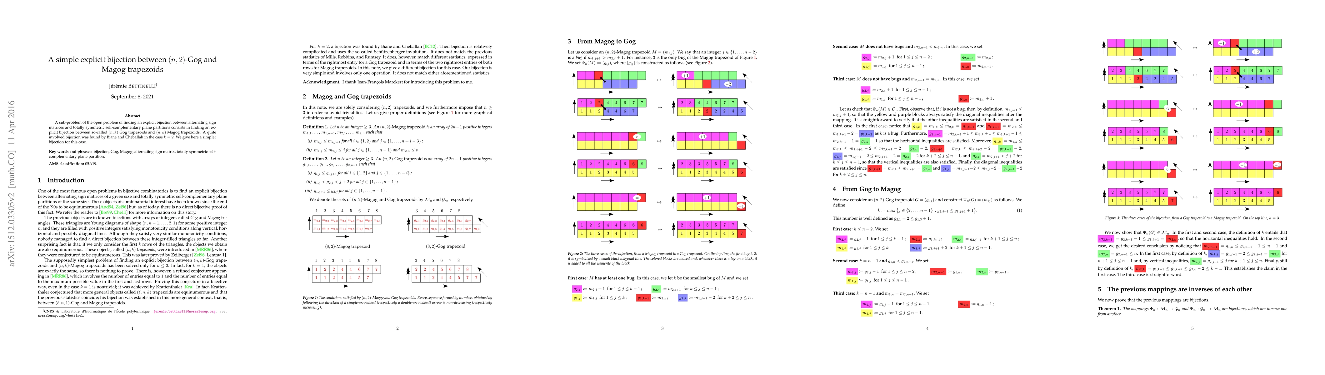This paper presents a straightforward explicit bijection between $(n,2)$ Gog and Magog trapezoids, simplifying the previously complex bijection found by Biane and Cheballah for $k=2$. This contributes to solving a sub-problem in the broader open issue of relating alternating sign matrices and totally symmetric self-complementary plane partitions.