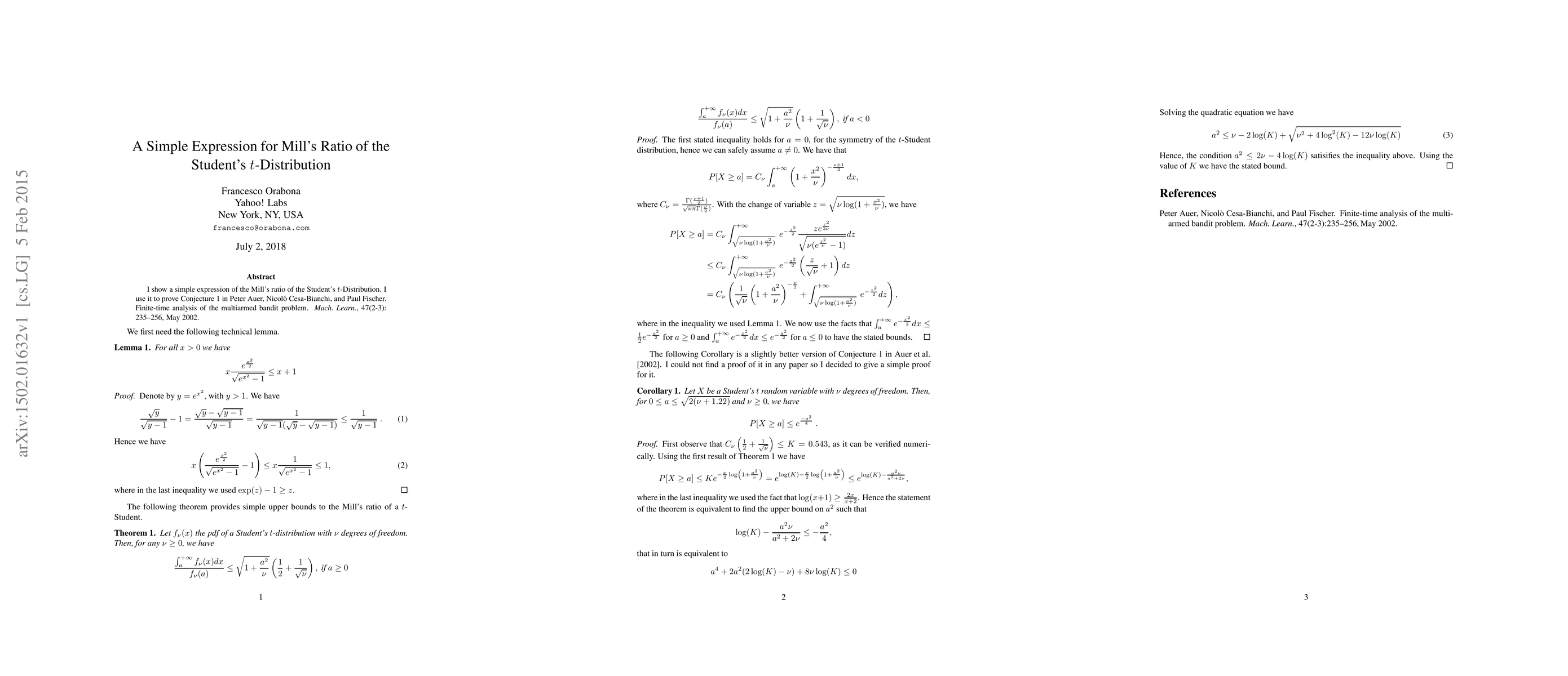 I show a simple expression of the Mill's ratio of the Student's t-Distribution. I use it to prove Conjecture 1 in P. Auer, N. Cesa-Bianchi, and P. Fischer. Finite-time analysis of the multiarmed bandit problem. Mach. Learn., 47(2-3):235--256, May 2002.
