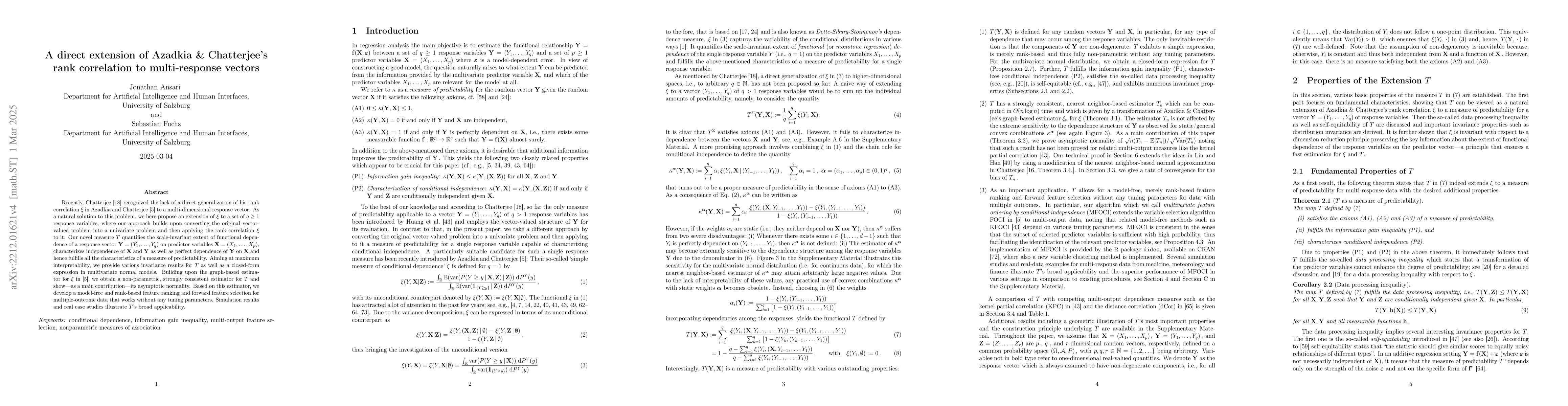 We propose a direct and natural extension of Azadkia & Chatterjee's rank correlation $T$ introduced in [4] to a set of $q \geq 1$ endogenous variables. The approach builds upon converting the original vector-valued problem into a univariate problem and then applying the rank correlation $T$ to it. The novel measure $T^q$ then quantifies the scale-invariant extent of functional dependence of an endogenous vector ${\bf Y} = (Y_1,\dots,Y_q)$ on a number of exogenous variables ${\bf X} = (X_1,\dots,X_p)$, $p\geq1$, characterizes independence of ${\bf X}$ and ${\bf Y}$ as well as perfect dependence of ${\bf Y}$ on ${\bf X}$ and hence fulfills all the desired characteristics of a measure of predictability. Aiming at maximum interpretability, we provide various general invariance and continuity conditions for $T^q$ as well as novel ordering results for conditional distributions, revealing new insights into the nature of $T$. Building upon the graph-based estimator for $T$ in [4], we present a non-parametric estimator for $T^q$ that is strongly consistent in full generality, i.e., without any distributional assumptions. Based on this estimator we develop a model-free and dependence-based feature ranking and forward feature selection of multiple-outcome data, and establish tools for identifying networks between random variables. Real case studies illustrate the main aspects of the developed methodology.