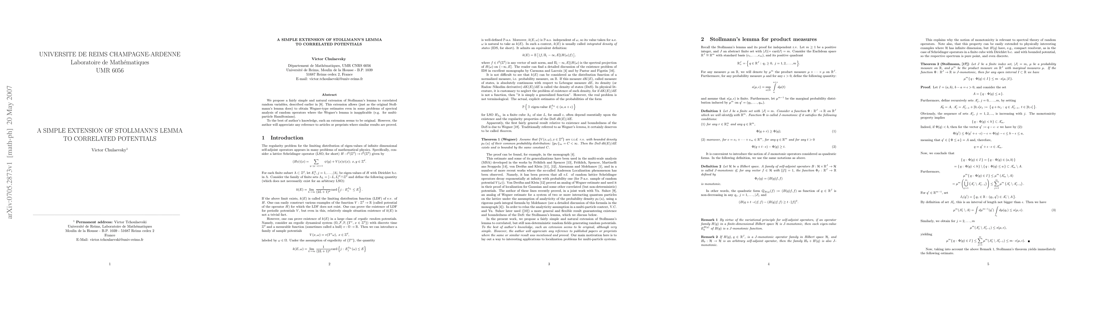 We propose a fairly simple and natural extension of Stollmann's lemma to correlated random variables. This extension allows (just as the original Stollmann's lemma does) to obtain Wegner-type estimates even in some problems of spectral analysis of random operators where the Wegner's lemma is inapplicable (e.g. for multi-particle Hamiltonians).