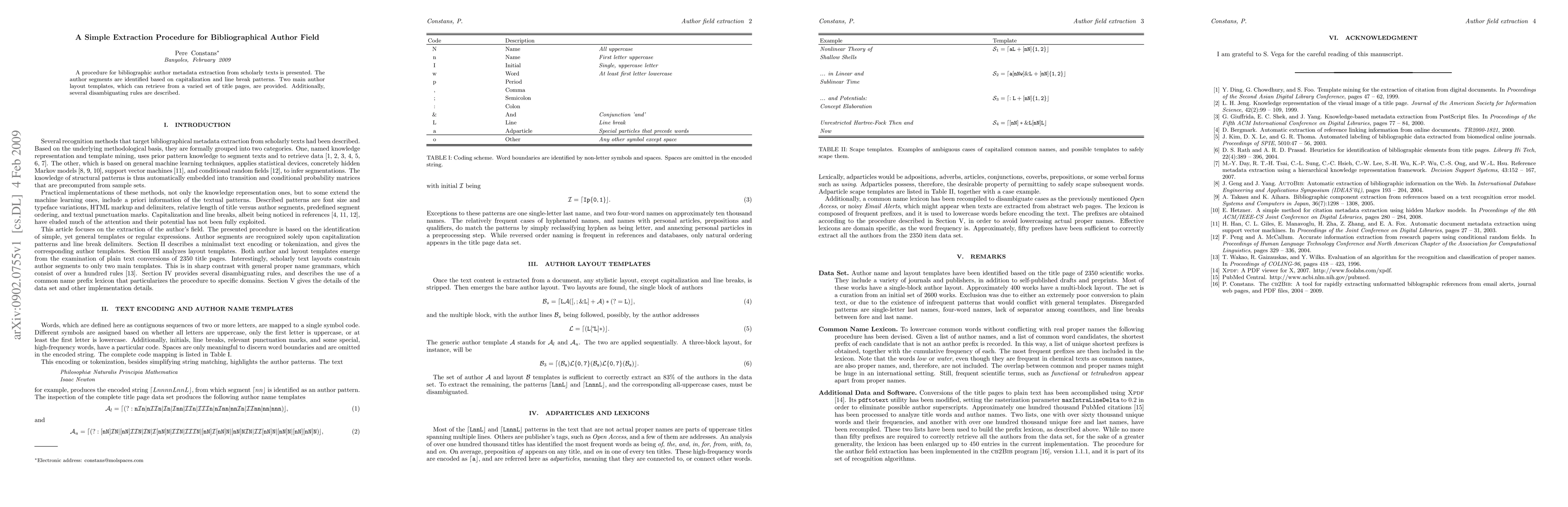 A procedure for bibliographic author metadata extraction from scholarly texts is presented. The author segments are identified based on capitalization and line break patterns. Two main author layout templates, which can retrieve from a varied set of title pages, are provided. Additionally, several disambiguating rules are described.
