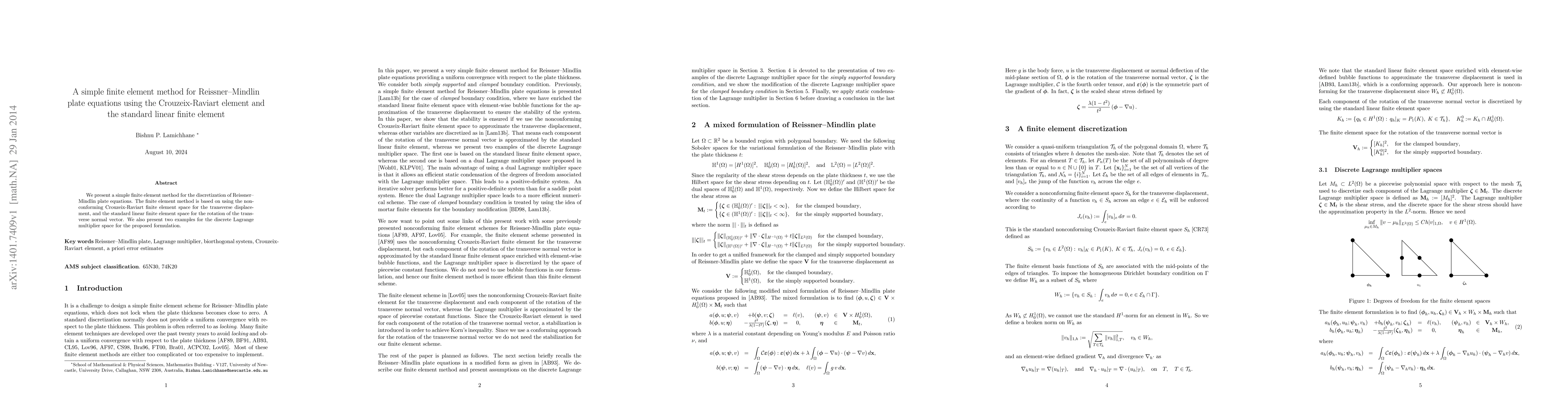 This paper proposes a straightforward finite element method for solving Reissner-Mindlin plate equations using the nonconforming Crouzeix-Raviart element for transverse displacement and standard linear elements for rotation. It includes two examples demonstrating the discrete Lagrange multiplier space in the proposed formulation.