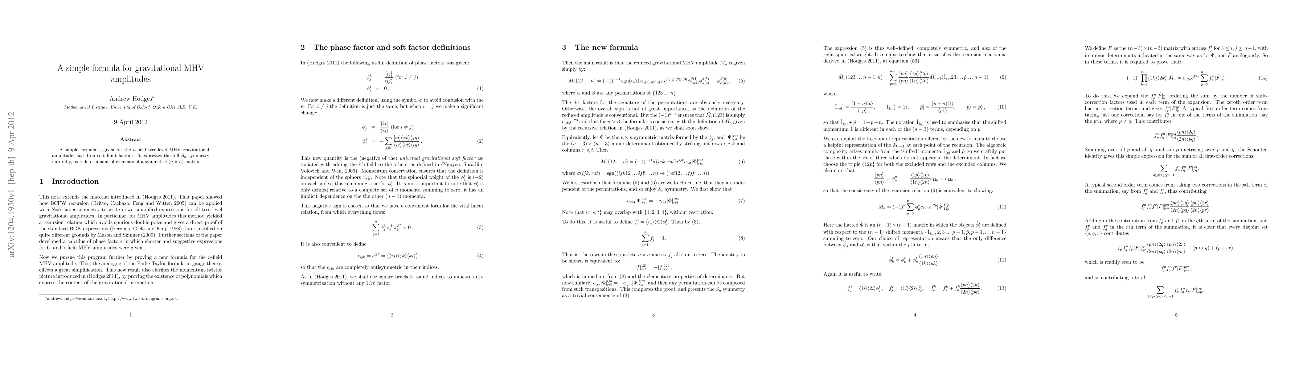 A simple formula is given for the n-field tree-level MHV gravitational amplitude, based on soft limit factors. It expresses the full S_n symmetry naturally, as a determinant of elements of a symmetric (n \times n) matrix.