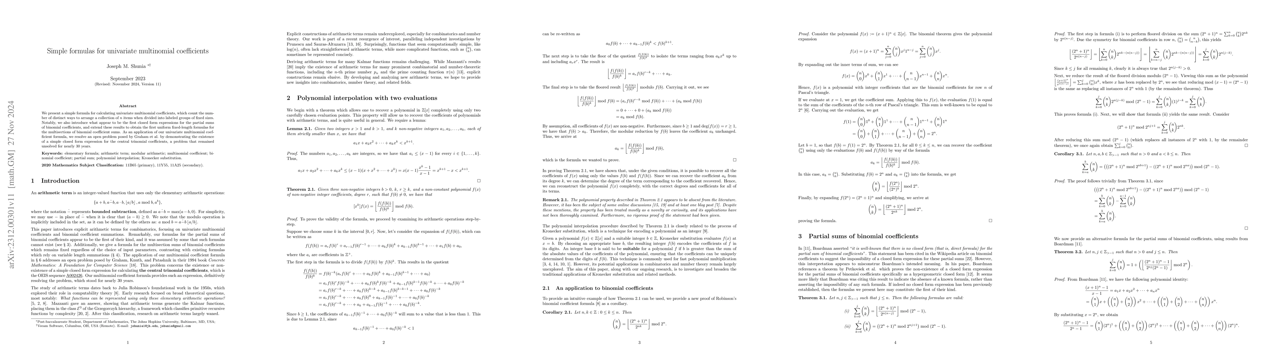 This paper proves that certain polynomials can be fully determined by just two evaluations and introduces a new formula for single-variable multinomial coefficients using basic arithmetic. It also resolves an open question on the central trinomial coefficients and poses a new problem regarding efficient computation of binomial coefficients modulo $n$.