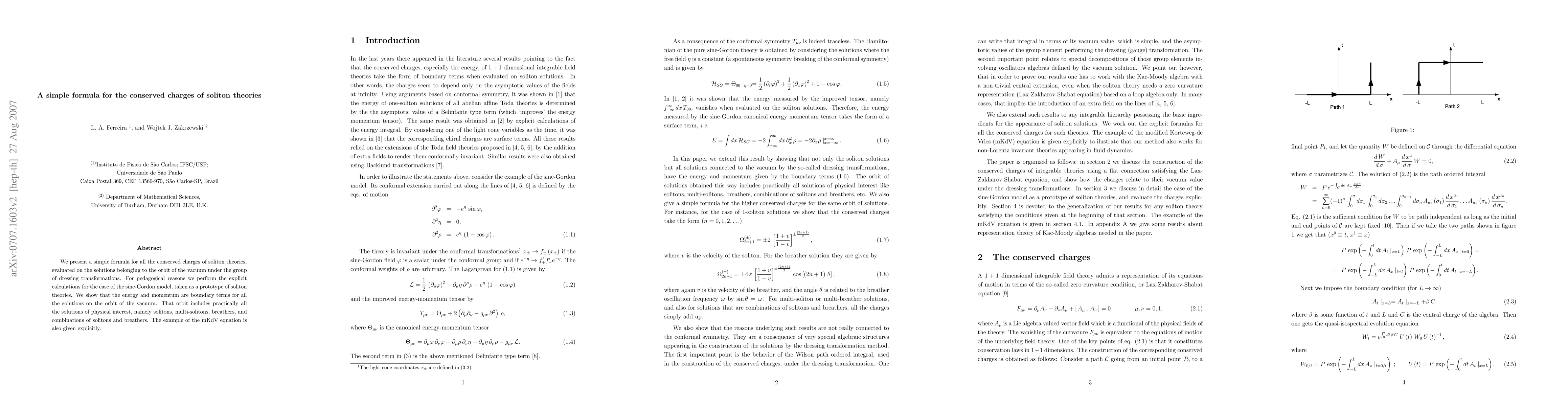 We present a simple formula for all the conserved charges of soliton theories, evaluated on the solutions belonging to the orbit of the vacuum under the group of dressing transformations. For pedagogical reasons we perform the explicit calculations for the case of the sine-Gordon model, taken as a prototype of soliton theories. We show that the energy and momentum are boundary terms for all the solutions on the orbit of the vacuum. That orbit includes practically all the solutions of physical interest, namely solitons, multi-solitons, breathers, and combinations of solitons and breathers. The example of the mKdV equation is also given explicitly.