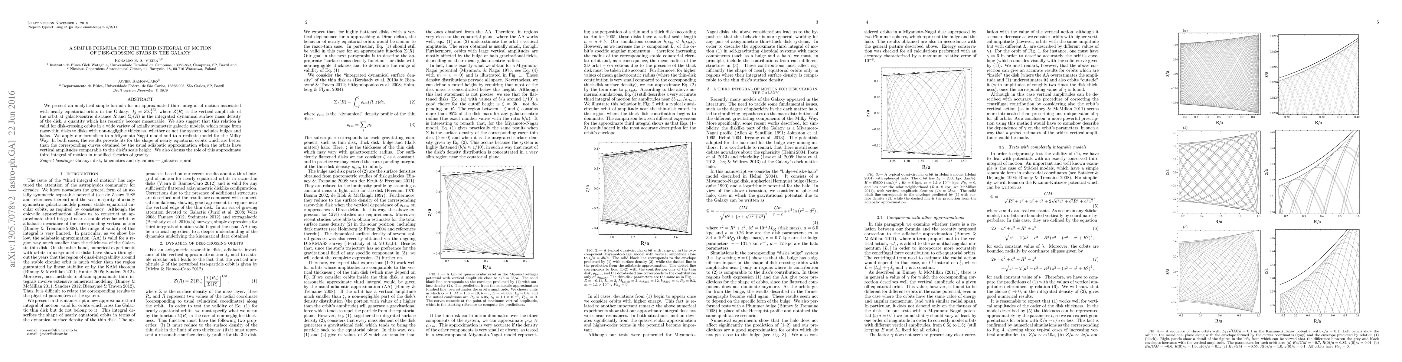 We present an analytical simple formula for an approximated third integral of motion associated with nearly equatorial orbits in the Galaxy: $I_{3}=Z\Sigma_{I}^{1/3}$, where $Z(R)$ is the vertical amplitude of the orbit at galactocentric distance $R$ and $\Sigma_{I}(R)$ is the integrated dynamical surface mass density of the disk, a quantity which has recently become measurable. We also suggest that this relation is valid for disk-crossing orbits in a wide variety of axially symmetric galactic models, which range from razor-thin disks to disks with non-negligible thickness, whether or not the system includes bulges and halos. We apply our formalism to a Miyamoto-Nagai model and to a realistic model for the Milky Way. In both cases, the results provide fits for the shape of nearly equatorial orbits which are better than the corresponding curves obtained by the usual adiabatic approximation when the orbits have vertical amplitudes comparable to the disk's scale height. We also discuss the role of this approximate third integral of motion in modified theories of gravity.