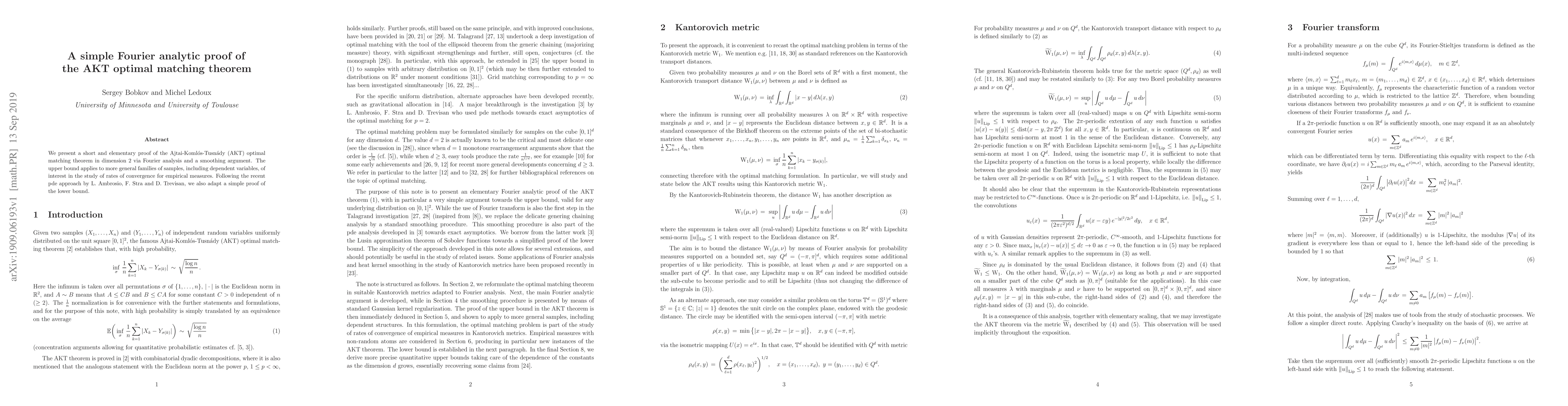 This paper provides a simplified proof of the Ajtai-Komlós-Tusnády (AKT) optimal matching theorem in 2D dimensions using Fourier analysis and smoothing techniques. The proof covers broader sample families, including dependent variables, and also adapts a simple lower bound proof from a recent PDE approach, with implications for empirical measure convergence rates.
