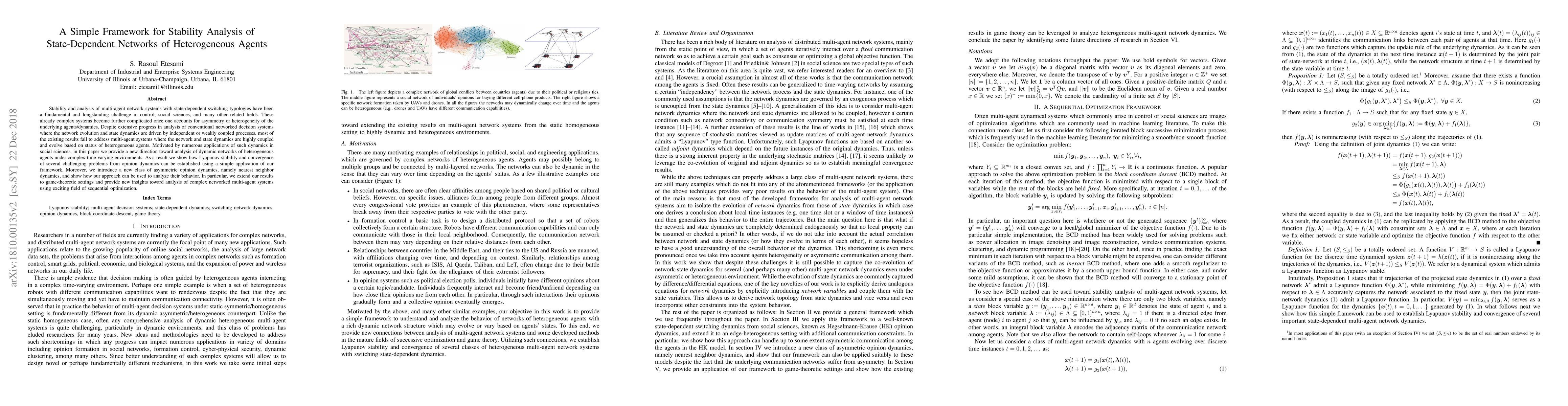 Stability and analysis of multi-agent network systems with state-dependent switching typologies have been a fundamental and longstanding challenge in control, social sciences, and many other related fields. These already complex systems become further complicated once one accounts for asymmetry or heterogeneity of the underlying agents/dynamics. Despite extensive progress in analysis of conventional networked decision systems where the network evolution and state dynamics are driven by independent or weakly coupled processes, most of the existing results fail to address multi-agent systems where the network and state dynamics are highly coupled and evolve based on status of heterogeneous agents. Motivated by numerous applications of such dynamics in social sciences, in this paper we provide a new direction toward analysis of dynamic networks of heterogeneous agents under complex time-varying environments. As a result we show how Lyapunov stability of several challenging problems from opinion dynamics can be established using a simple application of our framework. Moreover, we introduce a new class of asymmetric opinion dynamics, namely nearest neighbor dynamics, and show how our approach can be used to analyze their behavior. In particular, we extend our results to game-theoretic settings and provide new insights toward analysis of complex networked multi-agent systems using exciting field of sequential optimization.