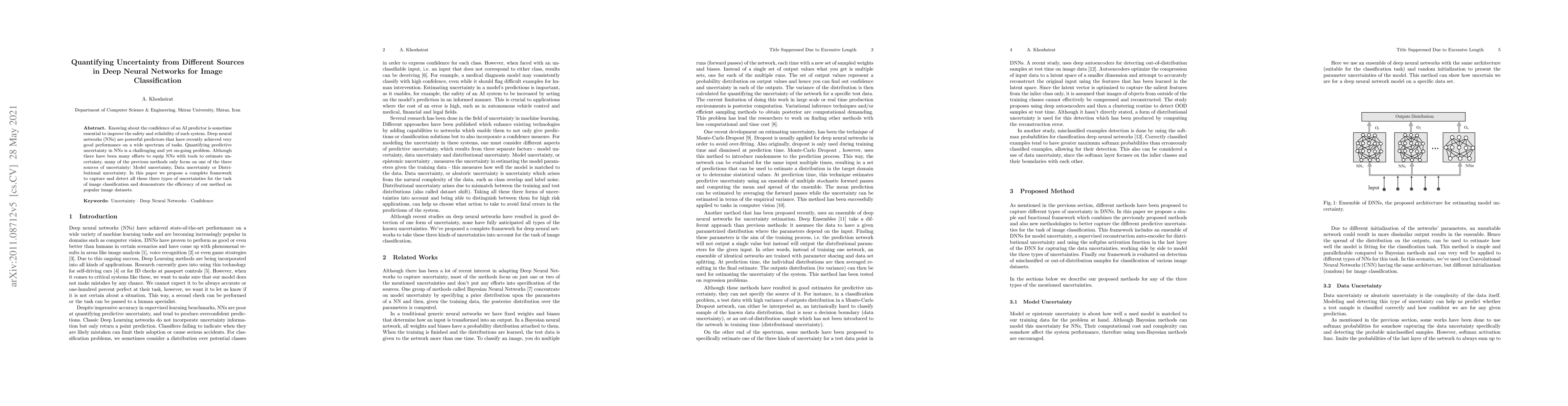 This paper proposes a framework to quantify three types of uncertainty in deep neural networks for image classification: model, distributional, and data uncertainty. The framework uses an ensemble of CNNs, a supervised reconstruction auto-encoder, and activation outputs to capture these uncertainties, demonstrating effectiveness on standard image datasets.