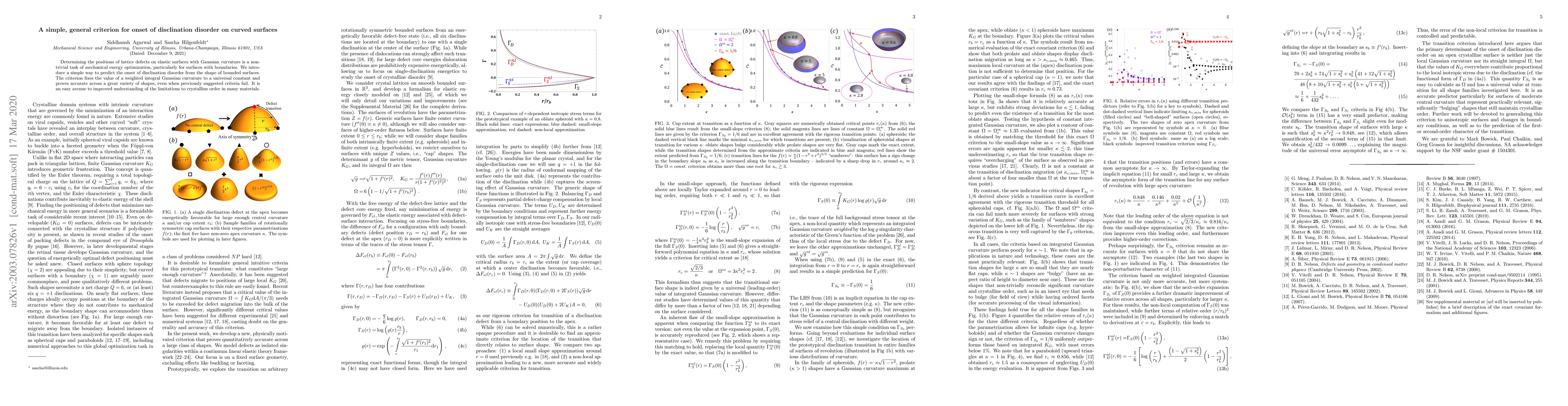 Determining the positions of lattice defects on elastic surfaces with Gaussian curvature is a non-trivial task of mechanical energy optimization, particularly for surfaces with boundaries. We introduce a simple way to predict the onset of disclination disorder from the shape of bounded surfaces. The criterion fixes the value of a weighted integral Gaussian curvature to a universal constant and proves accurate across a great variety of shapes, even when previously suggested criteria fail. It is an easy avenue to improved understanding of the limitations to crystalline order in many materials.