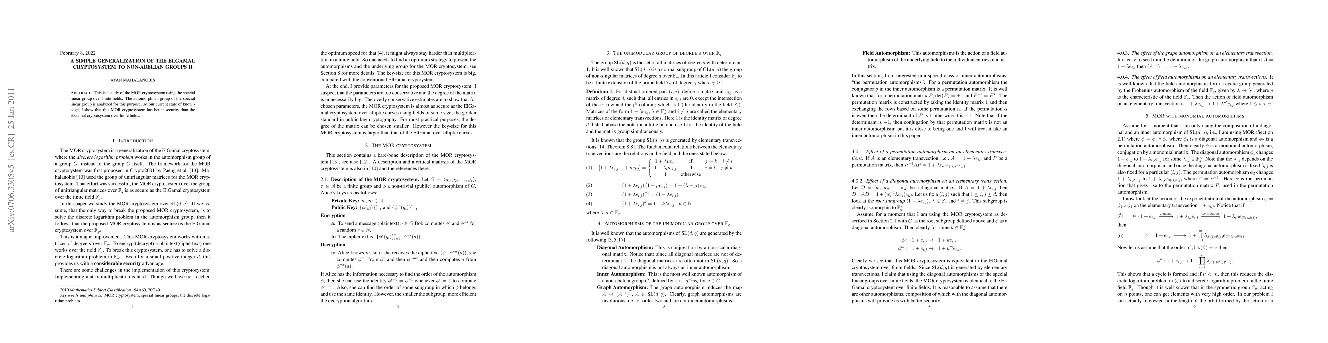 Summary: This paper explores the MOR cryptosystem based on the special linear group over finite fields, analyzing its automorphism group. It demonstrates that the MOR cryptosystem offers superior security compared to the traditional ElGamal cryptosystem over finite fields.