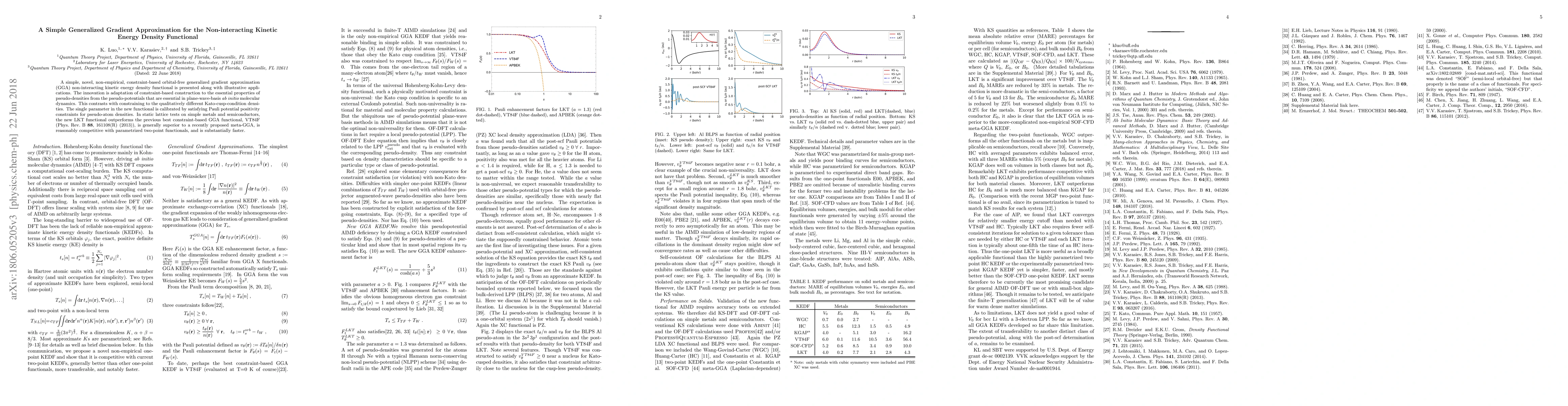 A simple, novel, non-empirical, constraint-based orbital-free generalized gradient approximation (GGA) non-interacting kinetic energy density functional is presented along with illustrative applications. The innovation is adaptation of constraint-based construction to the essential properties of pseudo-densities from the pseudo-potentials that are essential in plane-wave-basis {\it ab initio} molecular dynamics. This contrasts with constraining to the qualitatively different Kato-cusp-condition densities. The single parameter in the new functional is calibrated by satisfying Pauli potential positivity constraints for pseudo-atom densities. In static lattice tests on simple metals and semiconductors, the new LKT functional outperforms the previous best constraint-based GGA functional, VT84F (Phys.\ Rev.\ B \textbf{88}, 161108(R) (2013)), is generally superior to a recently proposed meta-GGA, is reasonably competitive with parametrized two-point functionals, and is substantially faster.