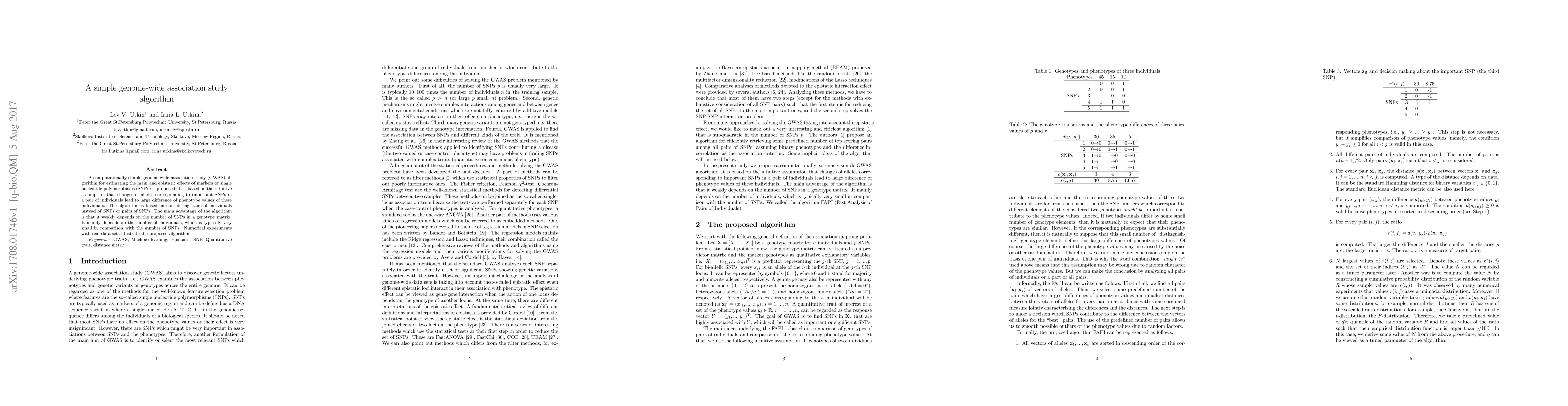A computationally simple genome-wide association study (GWAS) algorithm for estimating the main and epistatic effects of markers or single nucleotide polymorphisms (SNPs) is proposed. It is based on the intuitive assumption that changes of alleles corresponding to important SNPs in a pair of individuals lead to large difference of phenotype values of these individuals. The algorithm is based on considering pairs of individuals instead of SNPs or pairs of SNPs. The main advantage of the algorithm is that it weakly depends on the number of SNPs in a genotype matrix. It mainly depends on the number of individuals, which is typically very small in comparison with the number of SNPs. Numerical experiments with real data sets illustrate the proposed algorithm.