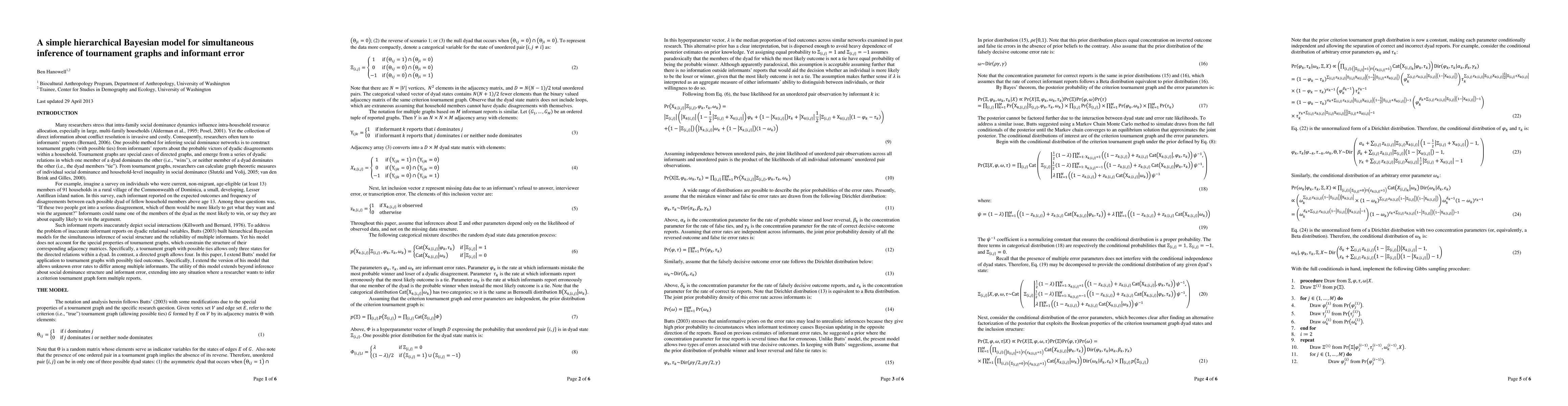 The paper presents a hierarchical Bayesian model for simultaneous inference of tournament graphs and informant error. From multiple informant reports or measurement instrument outputs, the model estimates the structure of a criterion (i.e., true) tournament graph with possibly tied outcomes. Tournament graphs with possibly tied outcomes are graphs in which there are three possible states for each unordered pair of graph nodes: node i wins and node j loses; node j wins and node i loses; neither node wins (i.e., tied outcome). The model also estimates the rates at which individual informants (or instruments) mistake the winning and losing dyad members, falsely report a tied outcome, and falsely report a decisive outcome. The model was developed to infer social dominance structure from multiple informants' reports, but is potentially useful for inferring any structure that can be characterized by a tournament graph, and which is measured from multiple reports.
