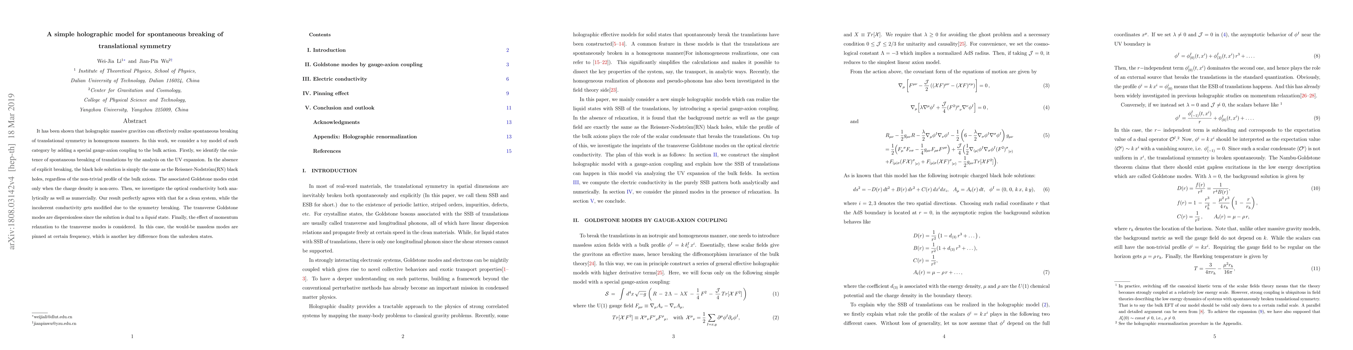 It has been shown that holographic massive gravities can effectively realize the states with spontaneous breaking of translational symmetry in a homogenous manner. In this work, we consider a toy model of such category by adding a special gauge-axion coupling to the bulk action. Firstly, we identify the existence of spontaneous breaking of translations by the UV analysis. In the absence of explicit breaking, the black hole solution is simply the same as the Reissner-Nodstrom(RN) black holes, regardless of the non-trivial profile of the bulk axions. The associated Goldstone modes exist only when the charge density is non-zero. Then, we investigate the optical conductivity both analytically as well as numercially. Our numerical result perfectly agrees with that for a clean system, while the incoherent part gets modified due to the symmetry breaking. The transverse Goldstone modes are dispersionless, which reflects the fact that the solution is dual to a liquid state. Finally, the effect of momentum relaxation to the transverse modes is also considered. In this case, the would-be massless modes are pinned at certain frequency, which is another key difference from unbroken phases.