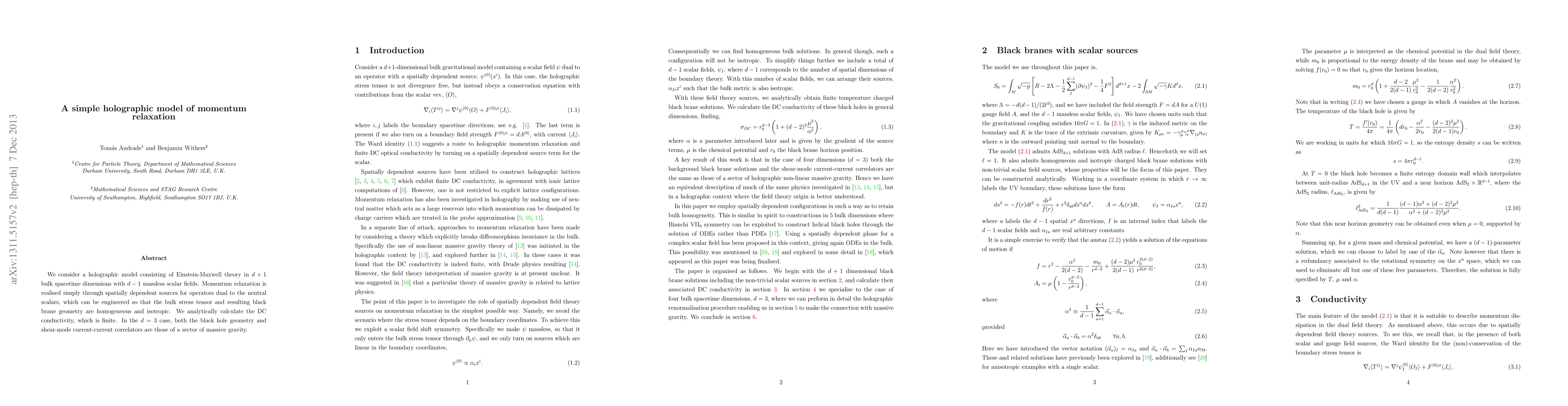 This paper presents a holographic model of momentum relaxation using Einstein-Maxwell theory with massless scalar fields, where relaxation is achieved through spatially dependent sources. The authors analytically compute a finite DC conductivity, revealing the geometry and correlators akin to a sector of massive gravity in the d=3 case.