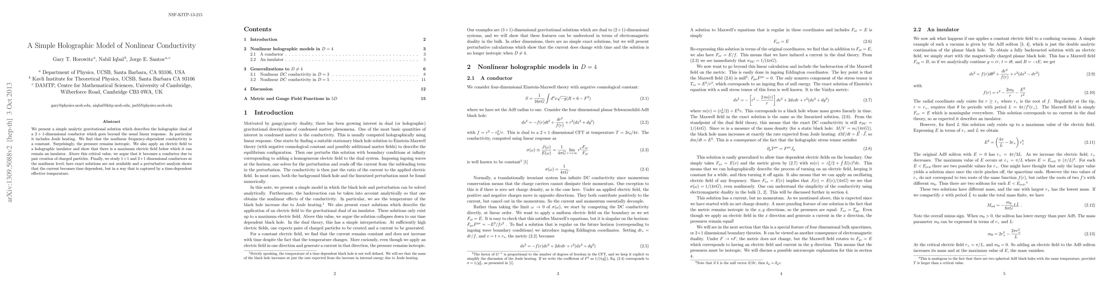 We present a simple analytic gravitational solution which describes the holographic dual of a 2+1-dimensional conductor which goes beyond the usual linear response. In particular it includes Joule heating. We find that the nonlinear frequency-dependent conductivity is a constant. Surprisingly, the pressure remains isotropic. We also apply an electric field to a holographic insulator and show that there is a maximum electric field below which it can remain an insulator. Above this critical value, we argue that it becomes a conductor due to pair creation of charged particles. Finally, we study 1+1 and 3+1 dimensional conductors at the nonlinear level; here exact solutions are not available and a perturbative analysis shows that the current becomes time dependent, but in a way that is captured by a time-dependent effective temperature.