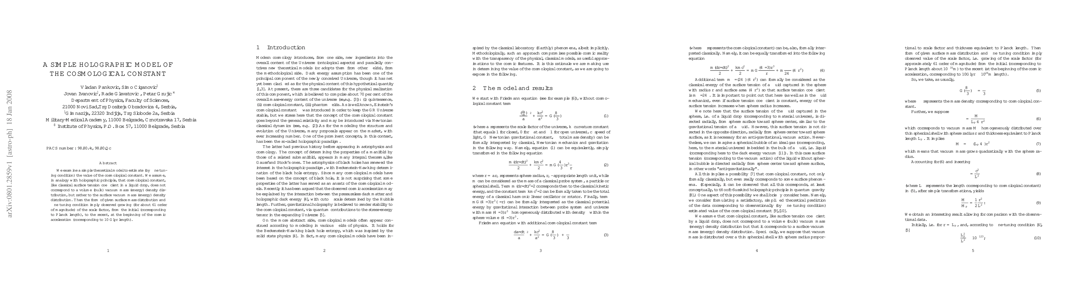 We examine a simple theoretical model to estimate (by fine tuning condition) the value of the cosmological constant. We assume, in analogy with holographic principle, that cosmological constant, like classical surface tension coefficient in a liquid drop, does not correspond to a volume (bulk) vacuum mass (energy) density distribution, but rather to the surface vacuum mass (energy) density distribution. Then the form of given surface mass distribution and fine tuning condition imply observed growing (for about 61 order of magnitude) of the scale factor, from the initial (corresponding to Planck length), to the recent, at the beginning of the cosmic acceleration (corresponding to 10 Glyr length).