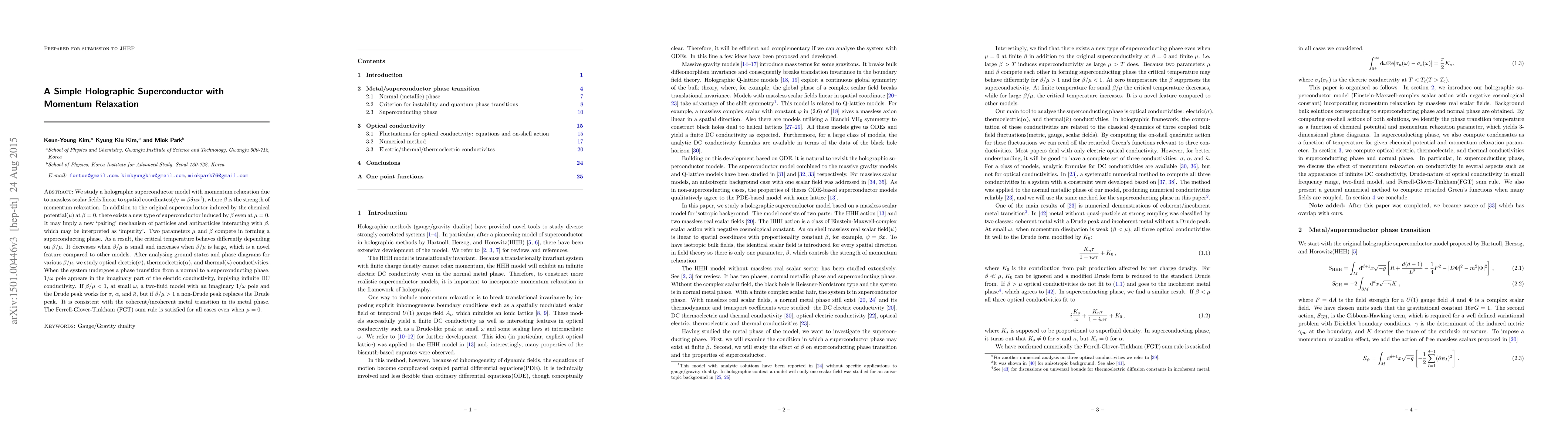 We study a holographic superconductor model with momentum relaxation due to massless scalar fields linear to spatial coordinates($\psi_I = \beta \delta_{Ii} x^i$), where $\beta$ is the strength of momentum relaxation. In addition to the original superconductor induced by the chemical potential($\mu$) at $\beta=0$, there exists a new type of superconductor induced by $\beta$ even at $\mu=0$. It may imply a new `pairing' mechanism of particles and antiparticles interacting with $\beta$, which may be interpreted as `impurity'. Two parameters $\mu$ and $\beta$ compete in forming a superconducting phase. As a result, the critical temperature behaves differently depending on $\beta/\mu$. It decreases when $\beta/\mu$ is small and increases when $\beta/\mu$ is large, which is a novel feature compared to other models. After analysing ground states and phase diagrams for various $\beta/\mu$, we study optical electric($\sigma$), thermoelectric($\alpha$), and thermal($\bar{\kappa}$) conductivities. When the system undergoes a phase transition from a normal to a superconducting phase, $1/\omega$ pole appears in the imaginary part of the electric conductivity, implying infinite DC conductivity. If $\beta/\mu <1$, at small $\omega$, a two-fluid model with an imaginary $1/\omega$ pole and the Drude peak works for $\sigma$, $\alpha$, and $\bar{\kappa}$, but if $\beta/\mu >1$ a non-Drude peak replaces the Drude peak. It is consistent with the coherent/incoherent metal transition in its metal phase. The Ferrell-Glover-Tinkham (FGT) sum rule is satisfied for all cases even when $\mu=0$.