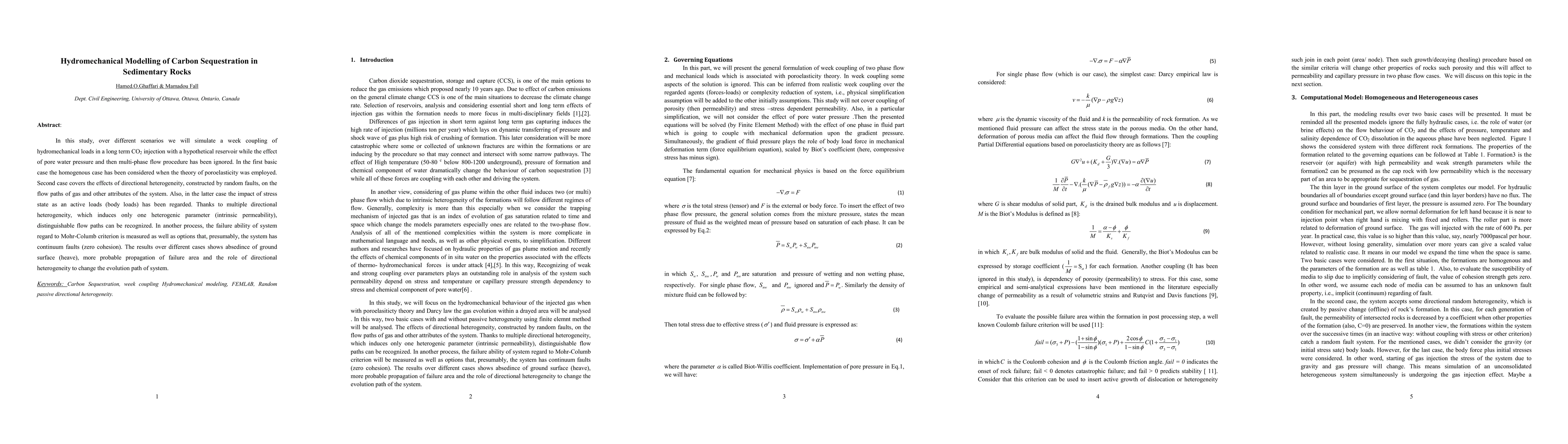 In this study, over different scenarios we will simulate a week coupling of hydromechanical loads in a long term CO2 injection with a hypothetical reservoir while the effect of pore water pressure and then multi-phase flow procedure has been ignored. In the first basic case the homogenous case has been considered when the theory of poroelasticity was employed. Second case covers the effects of directional heterogeneity, constructed by random faults, on the flow paths of gas and other attributes of the system. Also, in the latter case the impact of stress state as an active loads (body loads) has been regarded. Thanks to multiple directional heterogeneity, which induces only one heterogenic parameter (intrinsic permeability), distinguishable flow paths can be recognized. In another process, the failure ability of system regard to Mohr-Columb criterion is measured as well as options that, presumably, the system has continuum faults (zero cohesion). The results over different cases shows absedince of ground surface (heave), more probable propagation of failure area and the role of directional heterogeneity to change the evolution path of system.
