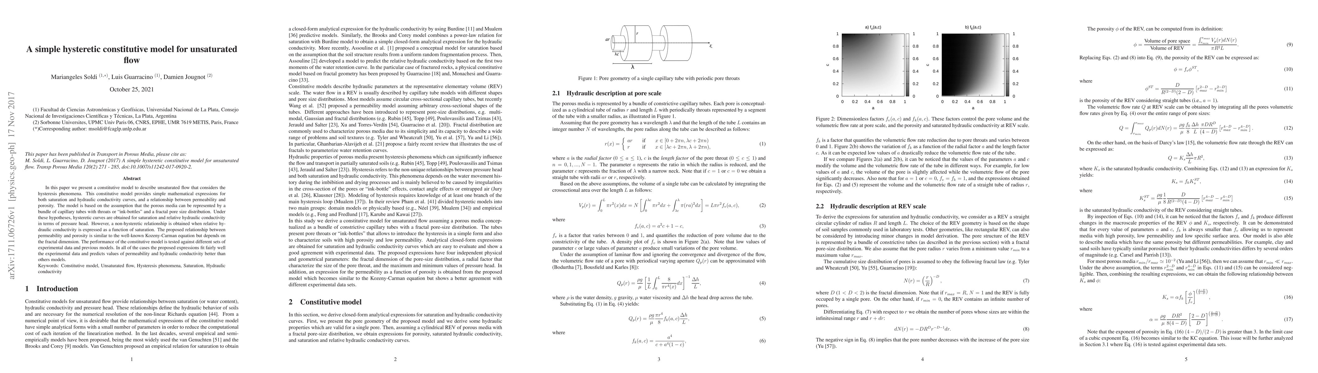 This paper introduces a simple hysteretic constitutive model for unsaturated flow that captures the hysteresis phenomena through a bundle of capillary tubes with fractal pore size distribution. The model provides accurate mathematical expressions for saturation and hydraulic conductivity curves, and it fits experimental data better than previous models.