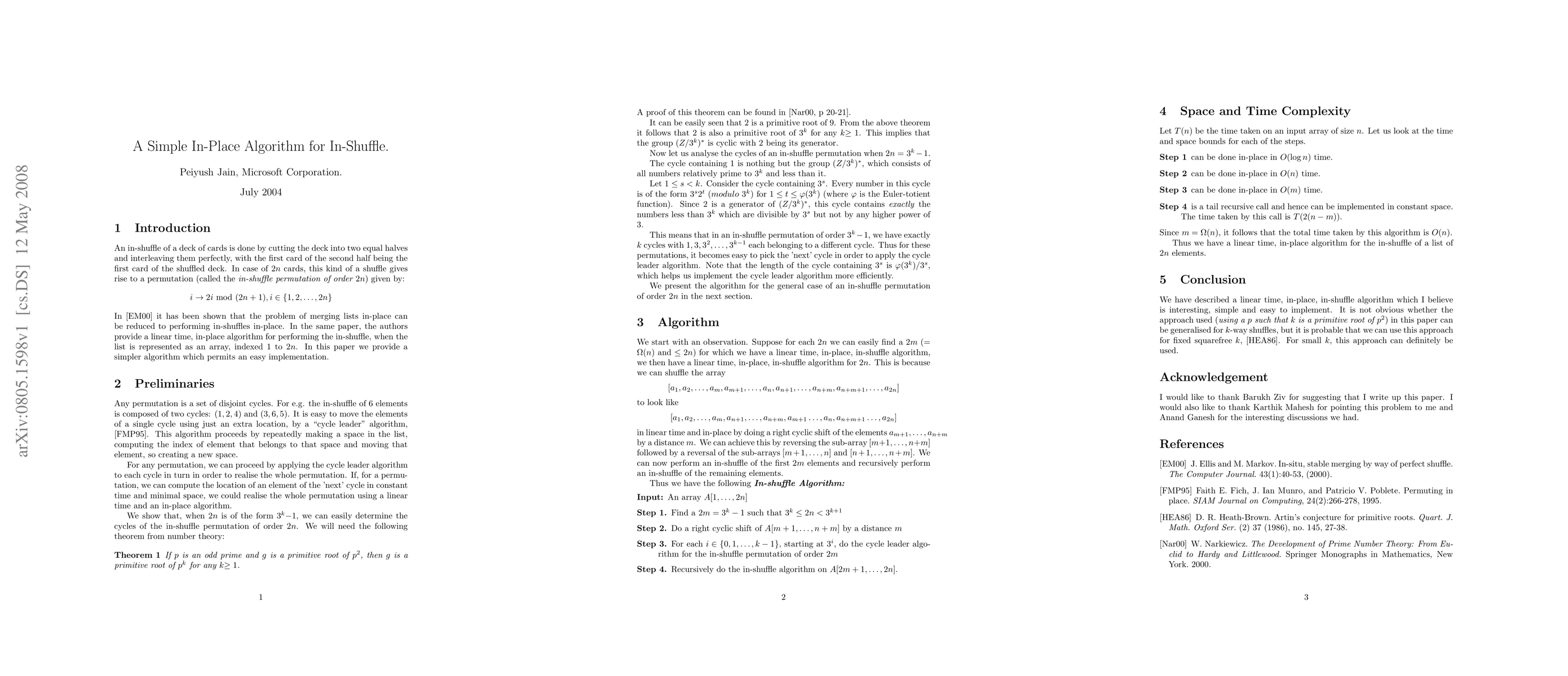 The paper presents a simple, linear time, in-place algorithm for performing a 2-way in-shuffle which can be used with little modification for certain other k-way shuffles.