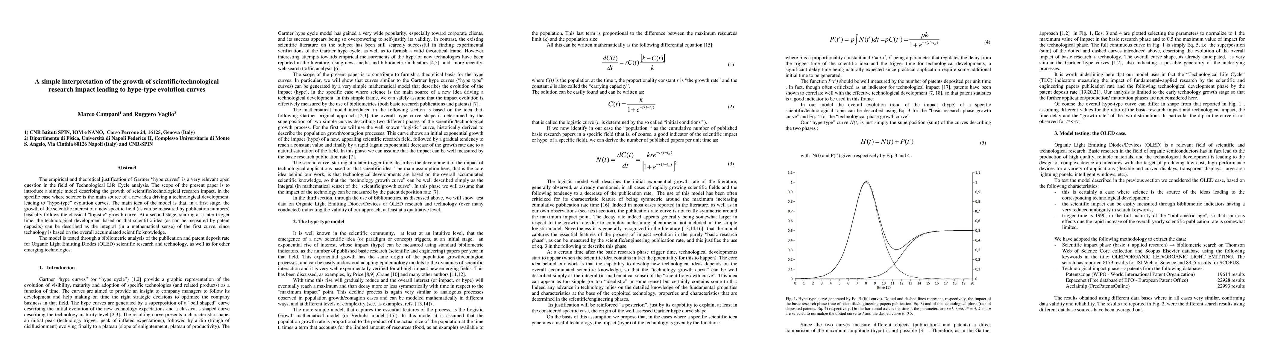 The empirical and theoretical justification of Gartner hype curves is a very relevant open question in the field of Technological Life Cycle analysis. The scope of the present paper is to introduce a simple model describing the growth of scientific/technological research impact, in the specific case where science is the main source of a new idea driving a technological development, leading to hype-type evolution curves. The main idea of the model is that, in a first stage, the growth of the scientific interest of a new specific field (as can be measured by publication numbers) basically follows the classical logistic growth curve. At a second stage, starting at a later trigger time, the technological development based on that scientific idea (as can be measured by patent deposits) can be described as the integral (in a mathematical sense) of the first curve, since technology is based on the overall accumulated scientific knowledge. The model is tested through a bibliometric analysis of the publication and patent deposit rate for Organic Light Emitting Diodes (OLED) scientific research and technology, as well as for other emerging technologies.