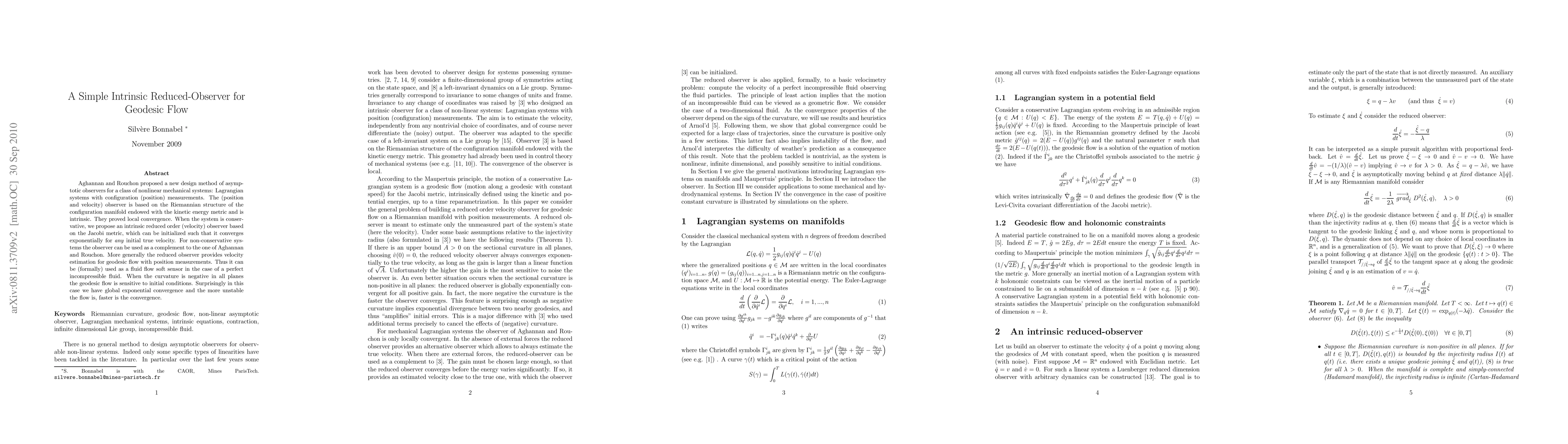 Aghannan and Rouchon proposed a new design method of asymptotic observers for a class of nonlinear mechanical systems: Lagrangian systems with configuration (position) measurements. The observer is based on the Riemannian structure of the configuration manifold endowed with the kinetic energy metric and is intrinsic. They proved local convergence. When the system is conservative, we propose a globally convergent intrinsic reduced-observer based on the Jacobi metric. For non-conservative systems the observer can be used as a complement to the one of Aghannan and Rouchon. More generally the reduced-observer provides velocity estimation for geodesic flow with position measurements. Thus it can be (formally) used as a fluid flow soft sensor in the case of a perfect incompressible fluid. When the curvature is negative in all planes the geodesic flow is sensitive to initial conditions. Surprisingly this instability yields faster convergence.