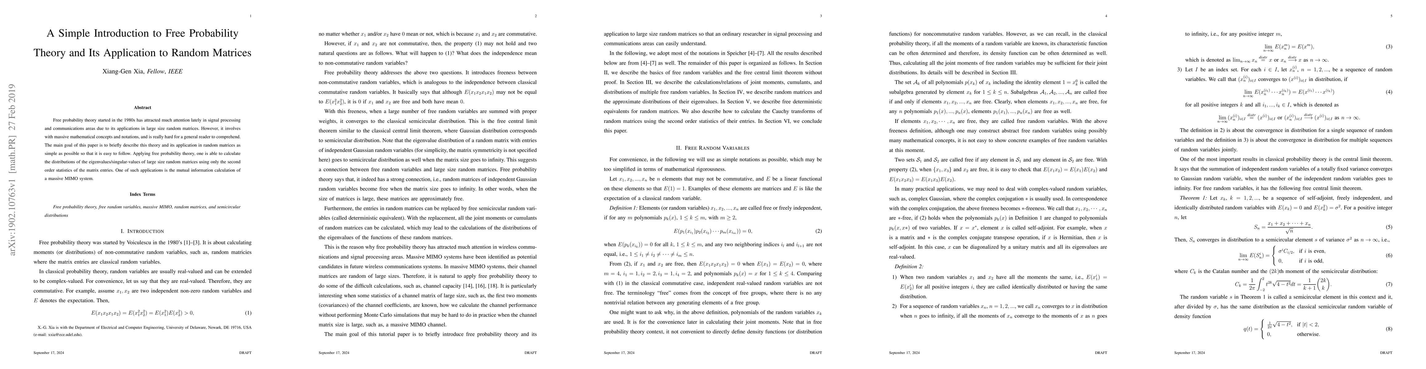 Free probability theory started in the 1980s has attracted much attention lately in signal processing and communications areas due to its applications in large size random matrices. However, it involves with massive mathematical concepts and notations, and is really hard for a general reader to comprehend. The main goal of this paper is to briefly describe this theory and its application in random matrices as simple as possible so that it is easy to follow. Applying free probability theory, one is able to calculate the distributions of the eigenvalues/singular-values of large size random matrices using only the second order statistics of the matrix entries. One of such applications is the mutual information calculation of a massive MIMO system.