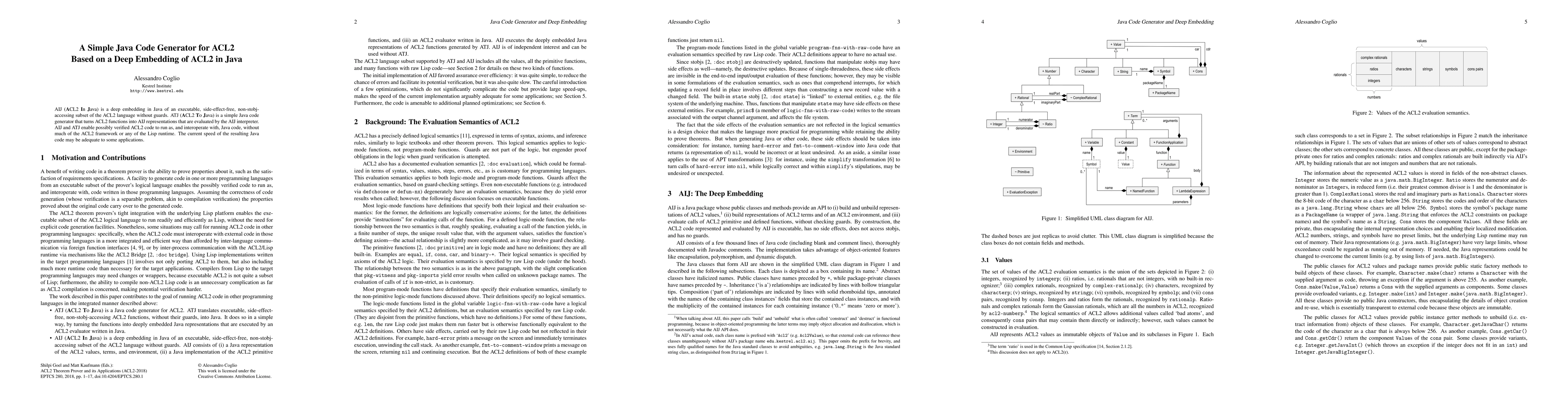 Summary: AIJ embeds a subset of ACL2 in Java, while ATJ generates simple Java code from ACL2 functions, enabling verified ACL2 code to run and interoperate with Java without the full ACL2 framework, though current performance may be adequate for some applications.