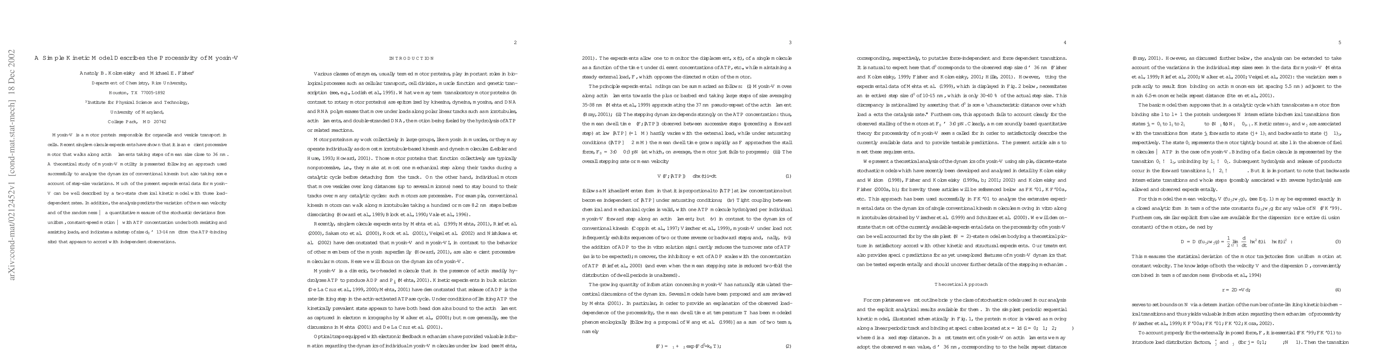 A new model describes myosin-V's processivity, showing it can take steps of 36nm, with varying step sizes depending on ATP concentration, offering insight into its efficient transport of organelles in cells.