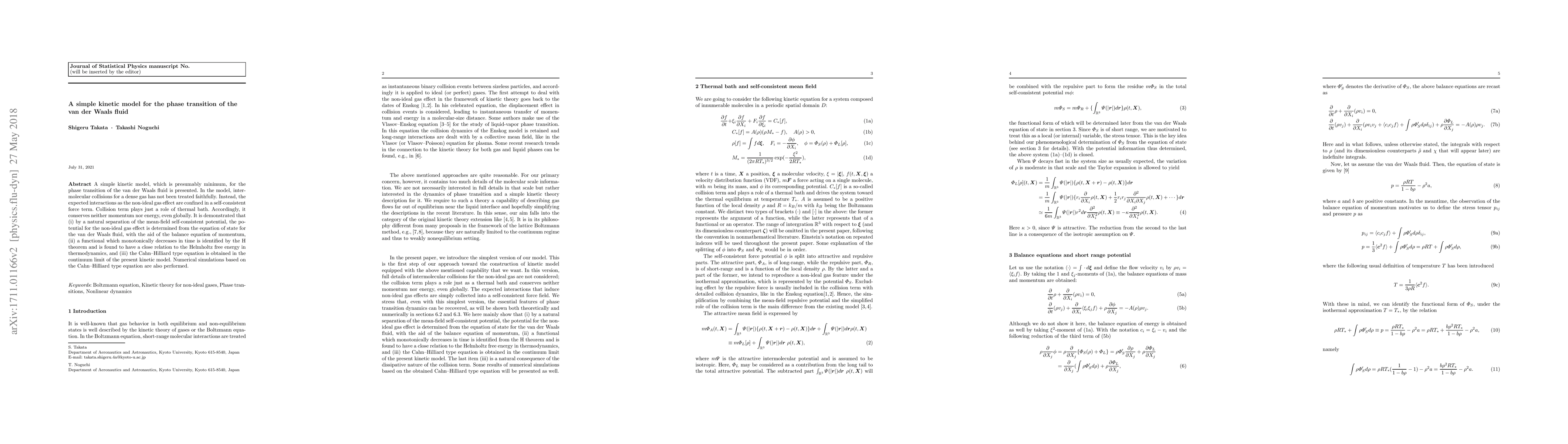A simple kinetic model, which is presumably minimum, for the phase transition of the van der Waals fluid is presented. In the model, intermolecular collisions for a dense gas has not been treated faithfully. Instead, the expected interactions as the non-ideal gas effect are confined in a self-consistent force term. Collision term plays just a role of thermal bath. Accordingly, it conserves neither momentum nor energy, even globally. It is demonstrated that (i) by a natural separation of the mean-field self-consistent potential, the potential for the non-ideal gas effect is determined from the equation of state for the van der Waals fluid, with the aid of the balance equation of momentum, (ii) a functional which monotonically decreases in time is identified by the H theorem and is found to have a close relation to the Helmholtz free energy in thermodynamics, and (iii) the Cahn--Hilliard type equation is obtained in the continuum limit of the present kinetic model. Numerical simulations based on the Cahn--Hilliard type equation are also performed.
