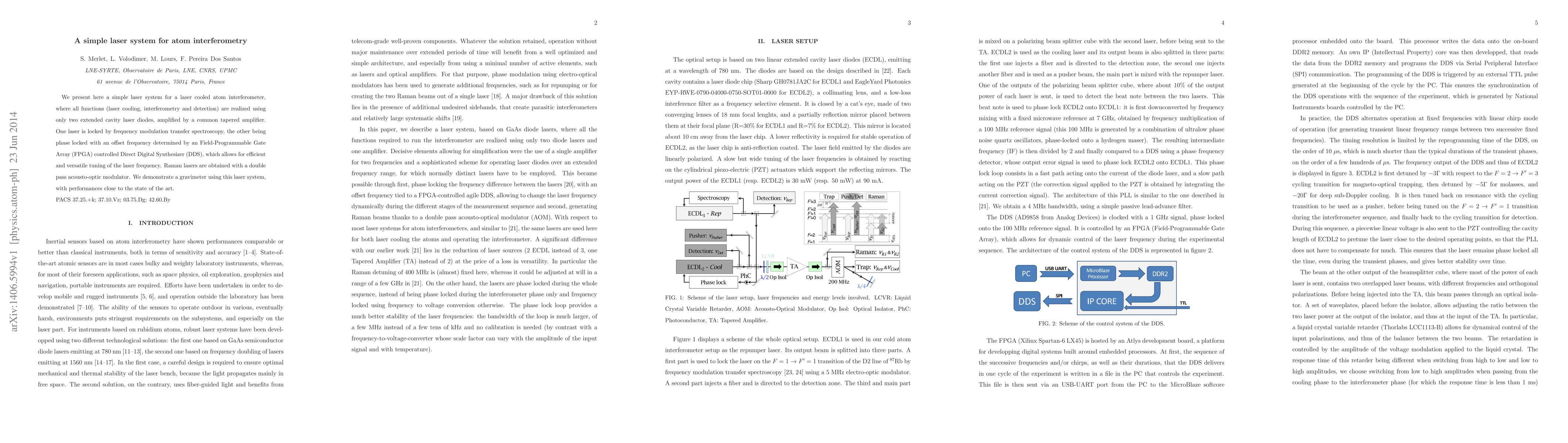 This paper describes a laser system utilizing two extended cavity laser diodes and a common amplifier for atom interferometry, achieving laser cooling, interferometry, and detection. The setup includes frequency modulation and phase locking, facilitated by an FPGA-controlled DDS, and demonstrates a gravimeter with state-of-the-art performance.