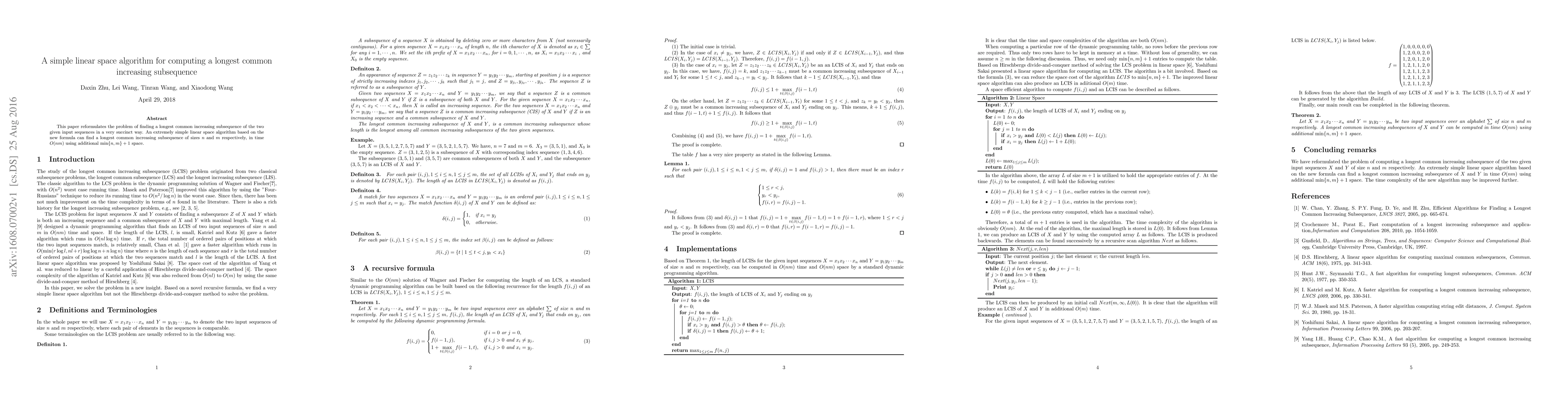 This paper reformulates the problem of finding a longest common increasing subsequence of the two given input sequences in a very succinct way. An extremely simple linear space algorithm based on the new formula can find a longest common increasing subsequence of sizes $n$ and $m$ respectively, in time $O(nm)$ using additional $\min\{n,m\}+1$ space.