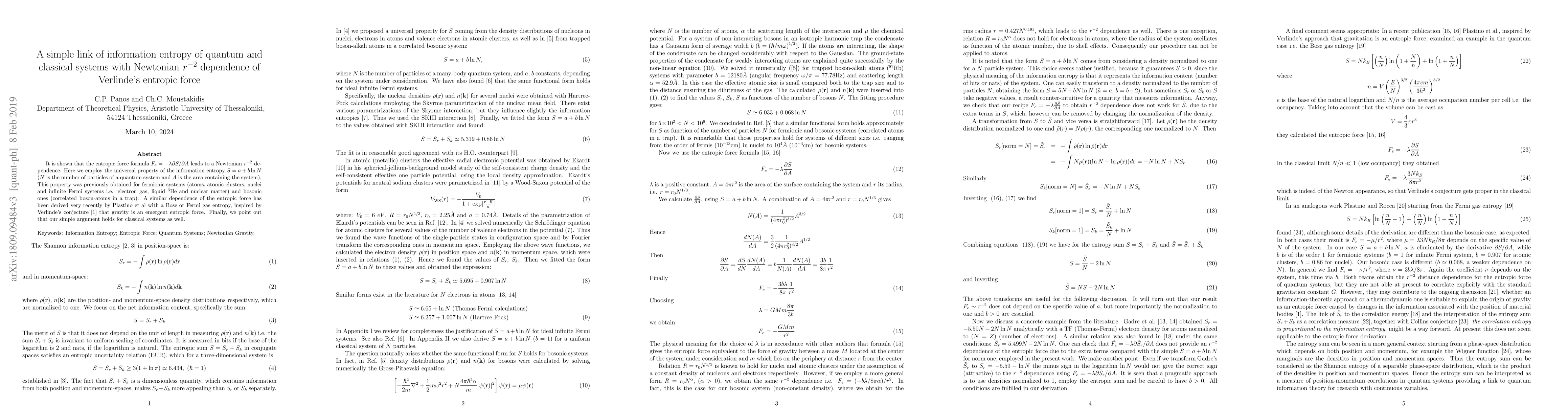 It is shown that the entropic force formula $F_e=-\lambda\partial S/\partial A$ leads to a Newtonian $r^{-2}$ dependence. Here we employ the universal property of the information entropy $S=a+b\ln N$ ($N$ is the number of particles of a quantum system and $A$ is the area containing the system). This property was previously obtained for fermionic systems (atoms, atomic clusters, nuclei and infinite Fermi systems i.e. electron gas, liquid $^3$He and nuclear matter) and bosonic ones (correlated boson-atoms in a trap). A similar dependence of the entropic force has been derived very recently by Plastino et al with a Bose or Fermi gas entropy, inspired by Verlinde's conjecture~\cite{Verlide-11} that gravity is an emergent entropic force. Finally, we point out that our simple argument holds for classical systems as well.