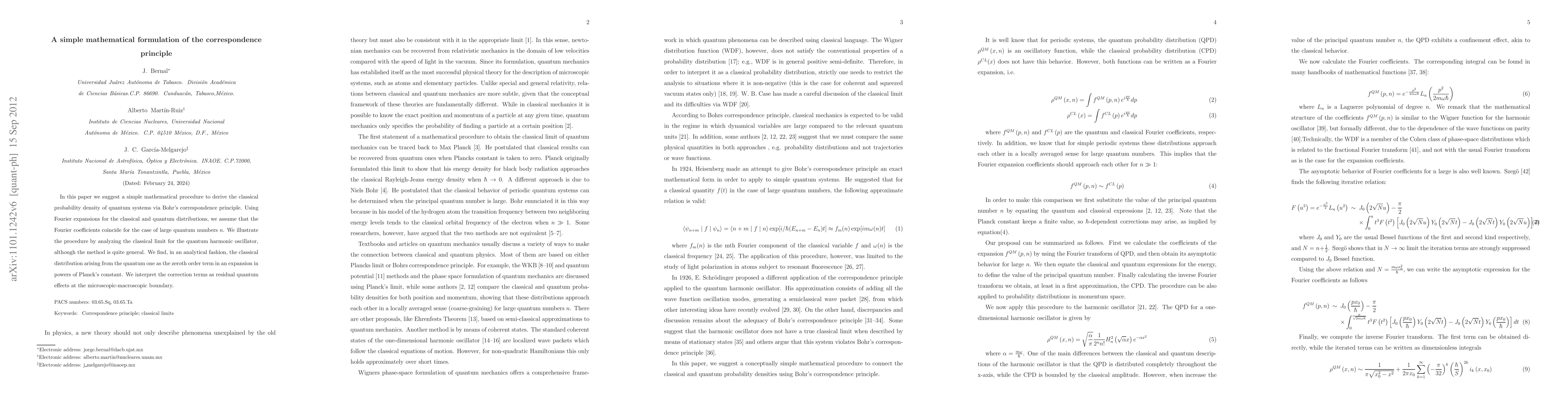 In this paper we suggest a simple mathematical procedure to derive the classical probability density of quantum systems via Bohr's correspondence principle. Using Fourier expansions for the classical and quantum distributions, we assume that the Fourier coefficients coincide for the case of large quantum numbers $n$. We illustrate the procedure by analyzing the classical limit for the quantum harmonic oscillator, although the method is quite general. We find, in an analytical fashion, the classical distribution arising from the quantum one as the zeroth order term in an expansion in powers of Planck's constant. We interpret the correction terms as residual quantum effects at the microscopic-macroscopic boundary.